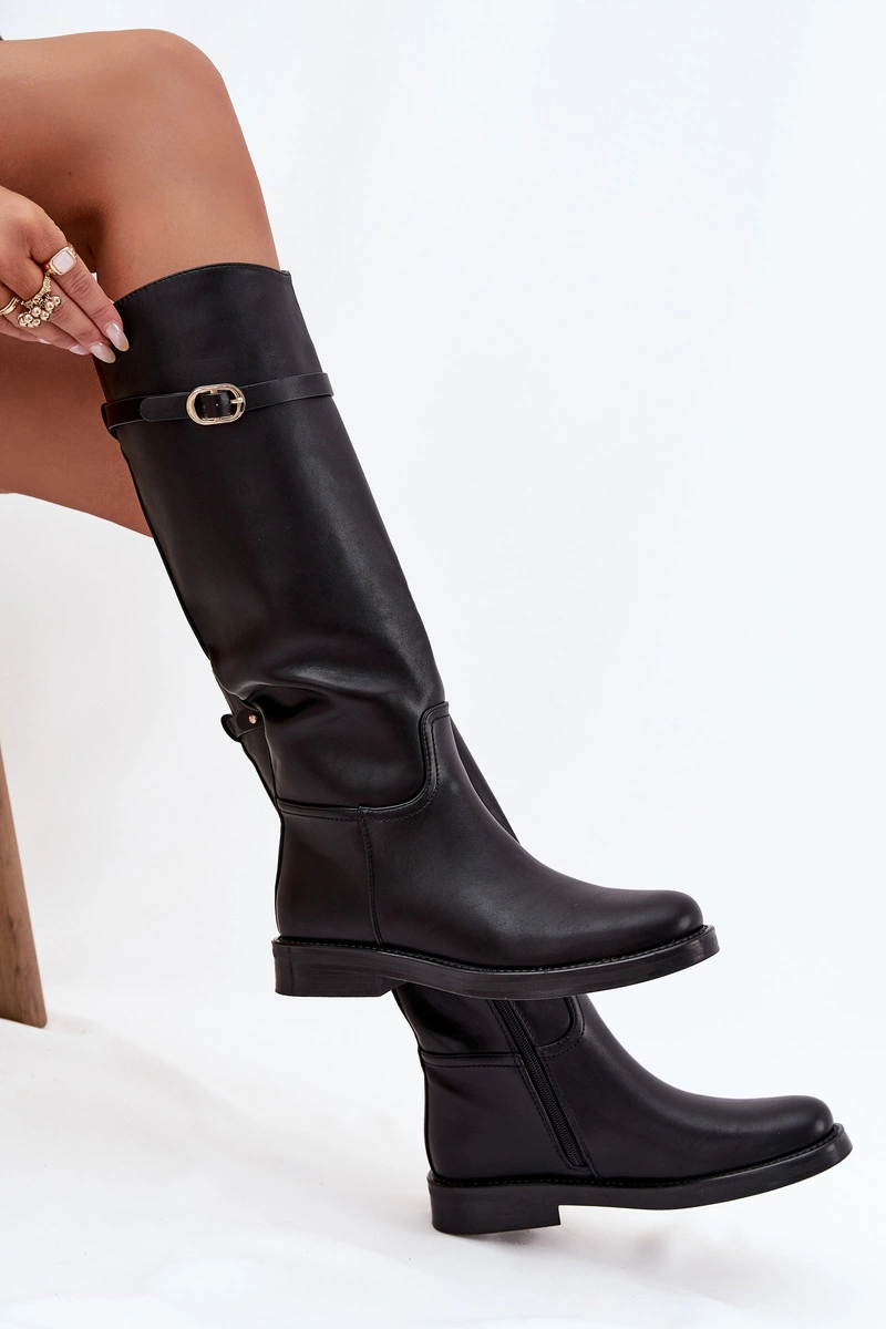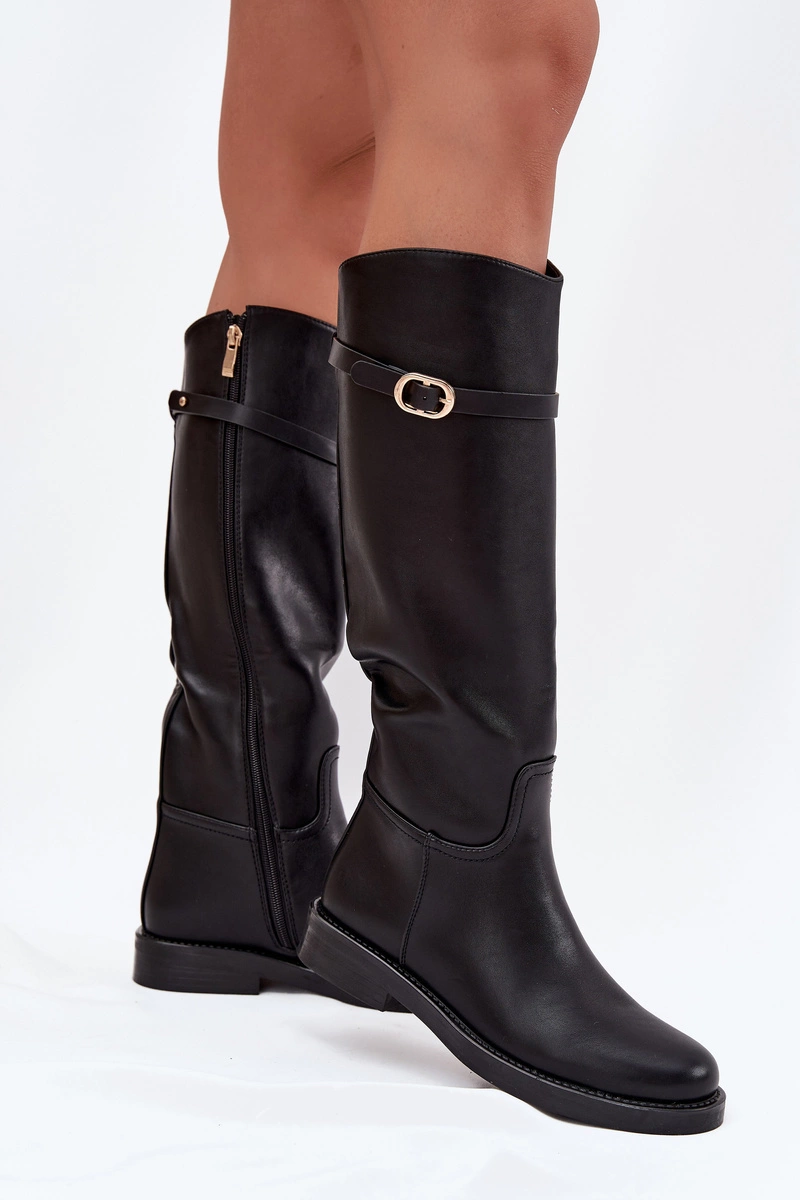 Kozaki Damskie Na Płaskim Obcasie Z Paskiem I Złotą Klamrą Czarne Sylvena