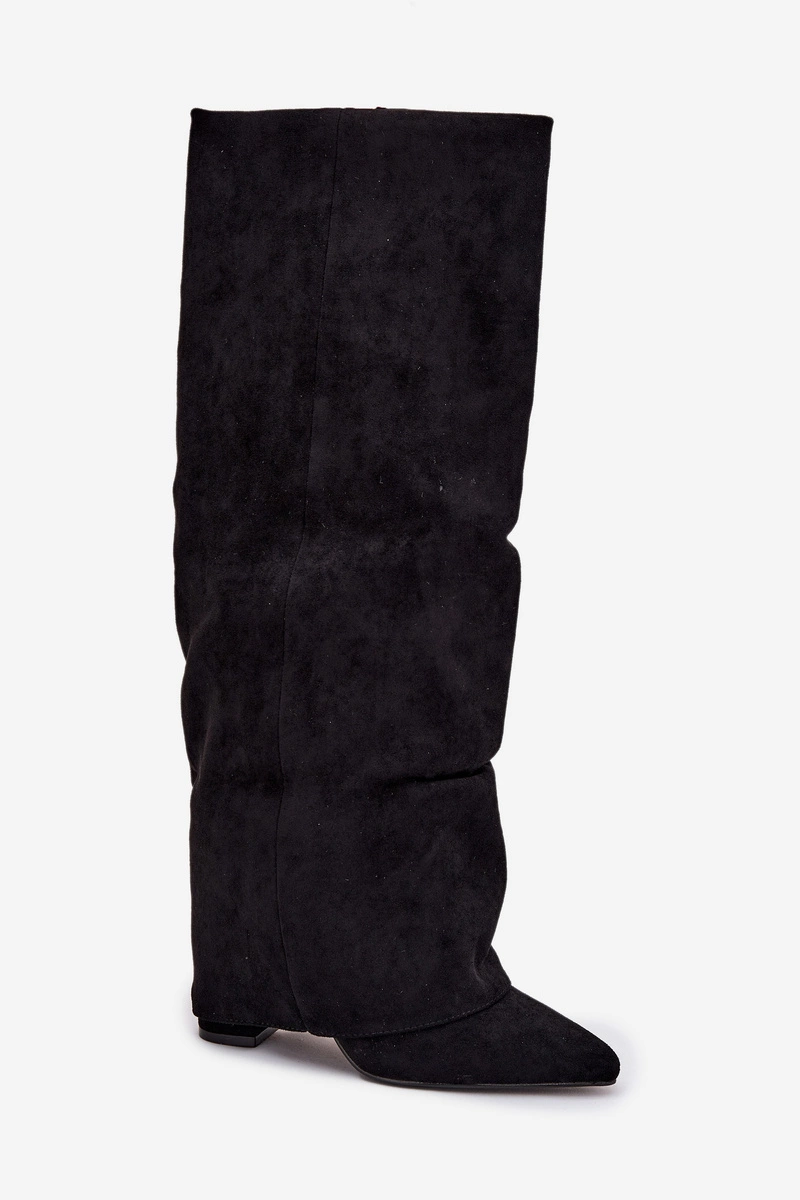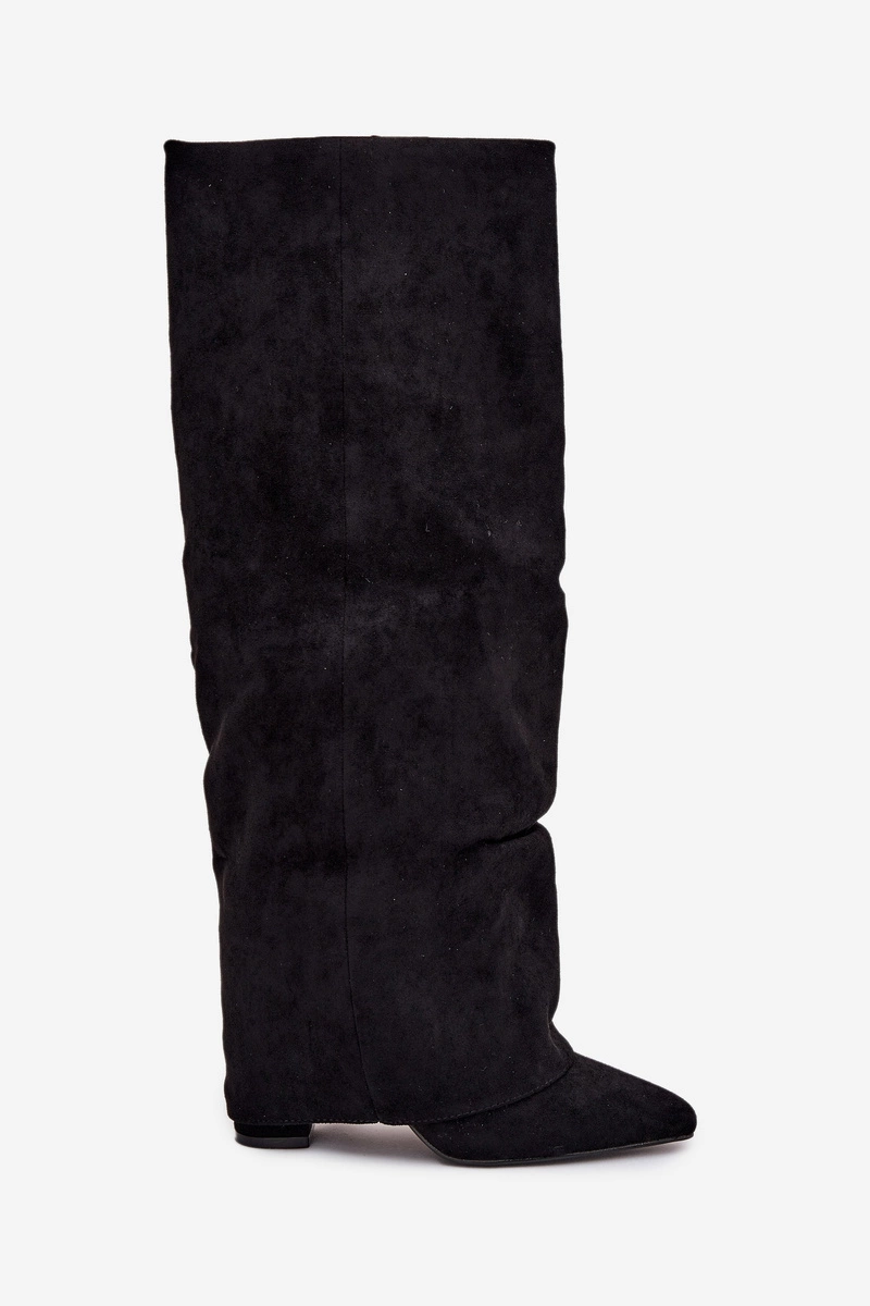 Ocieplane Kozaki Damskie Z Wywiniętą Cholewką Na Słupku Eko Zamszowe Czarne Elivira