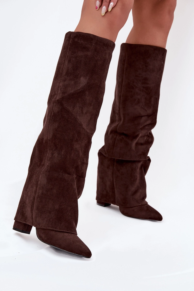 Ocieplane Kozaki Damskie Z Wywiniętą Cholewką Na Słupku Eko Zamszowe Czekoladowe Elivira