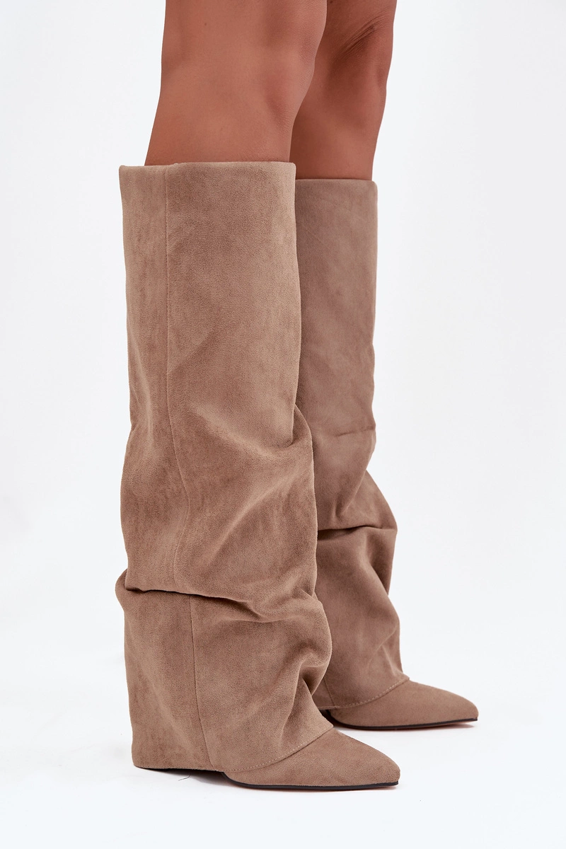 Ocieplane Kozaki Damskie Z Wywiniętą Cholewką Na Słupku Eko Zamszowe Beżowe Elivira