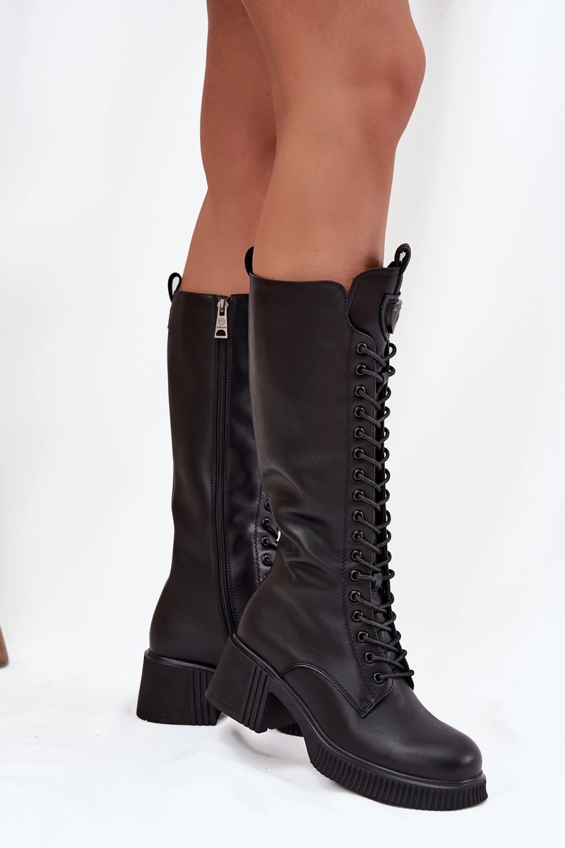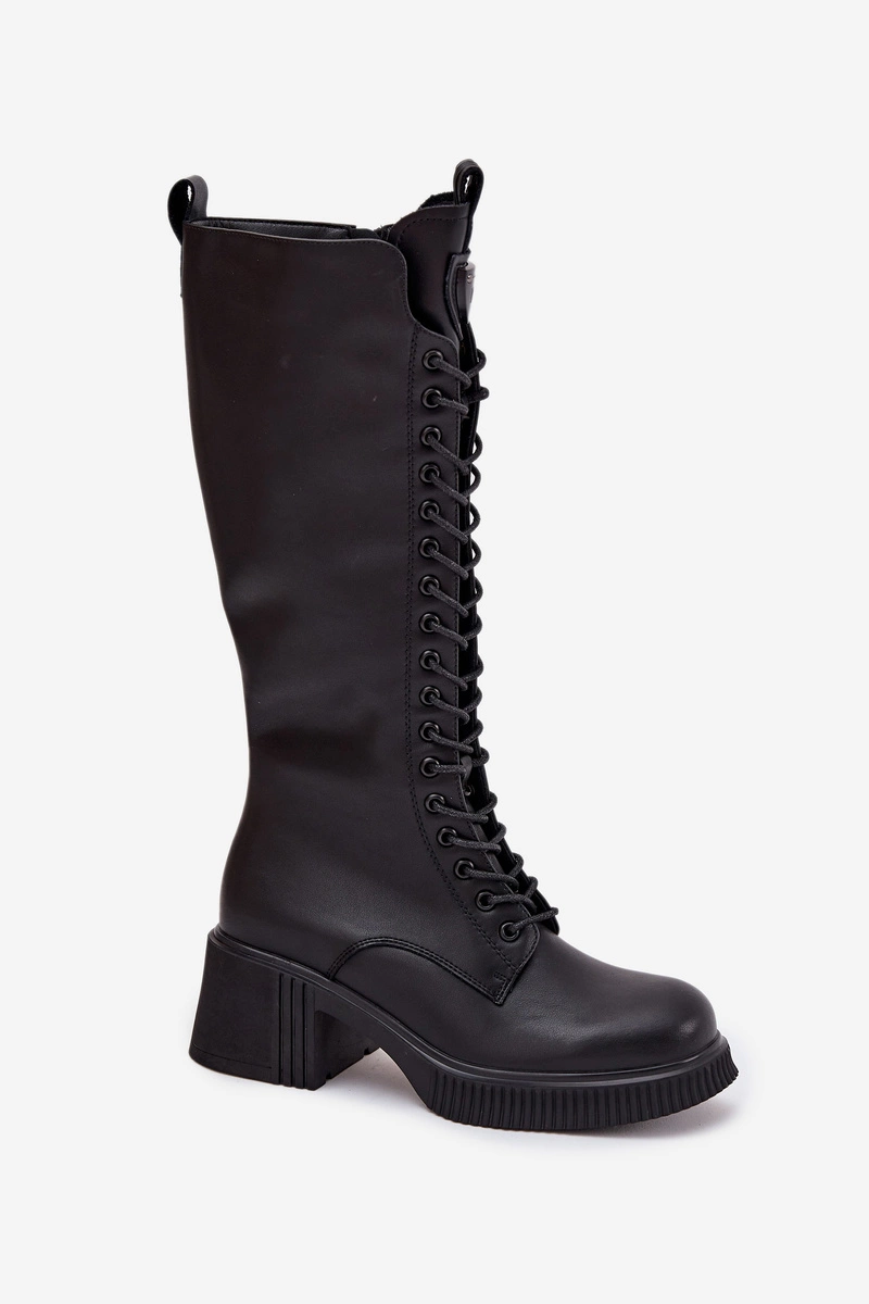 Skórzane Sznurowane Kozaki Na Klocku Ocieplane Vinceza 66804 Czarne