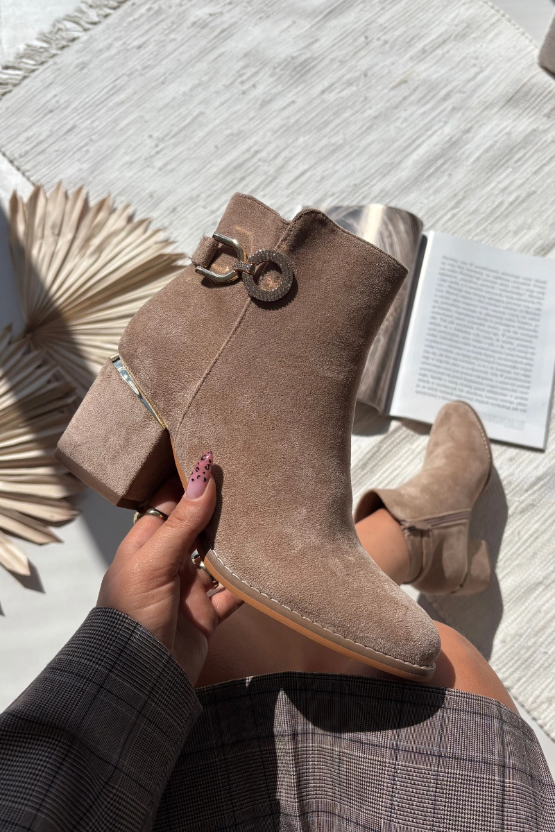 Ocieplane Botki Damskie Ze Złotymi Detalami Na Słupku Beżowe Dorisse