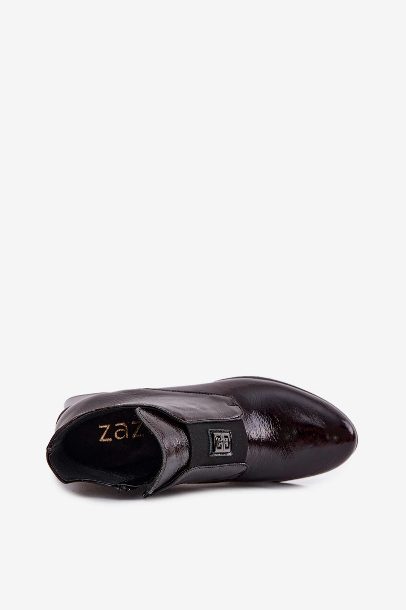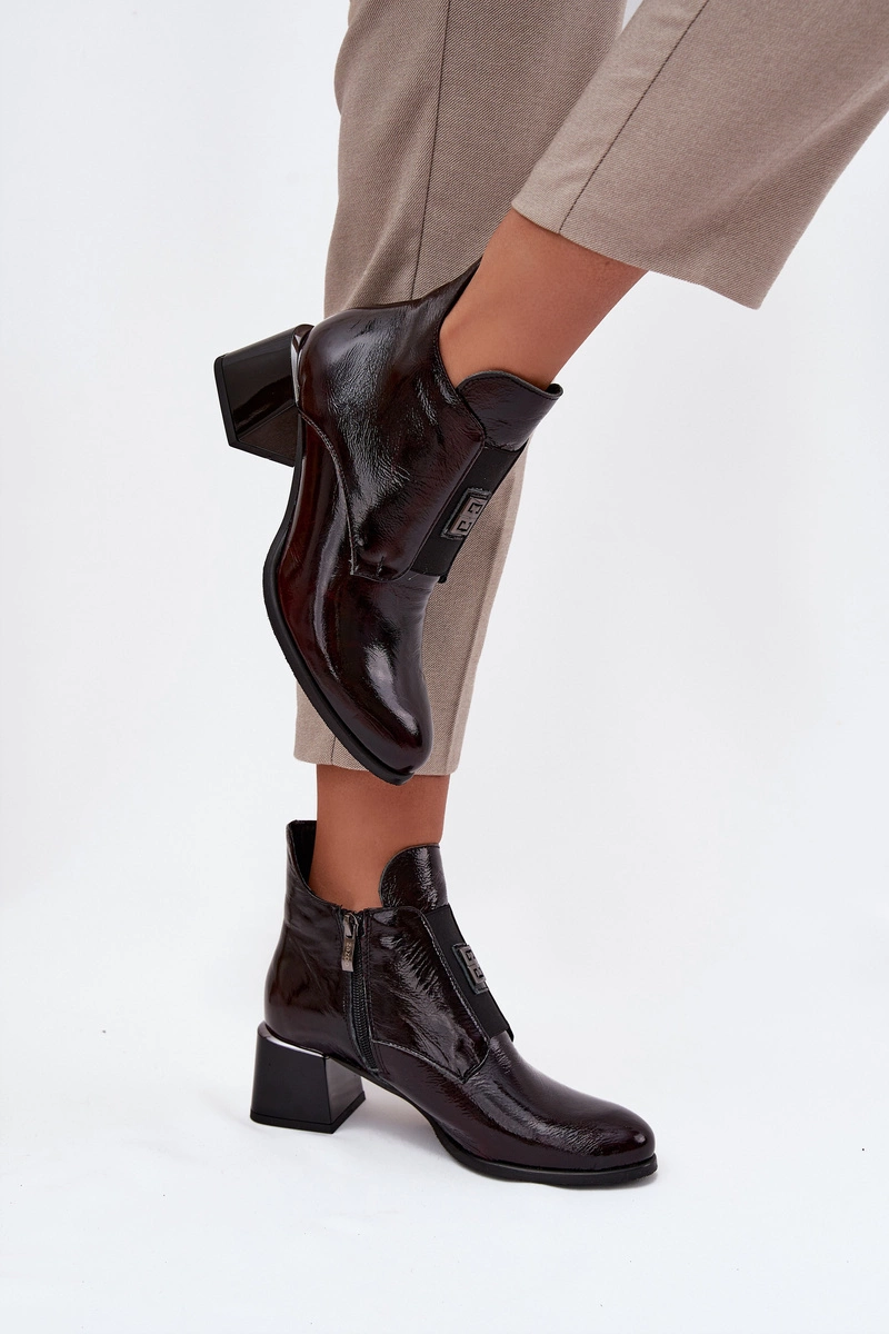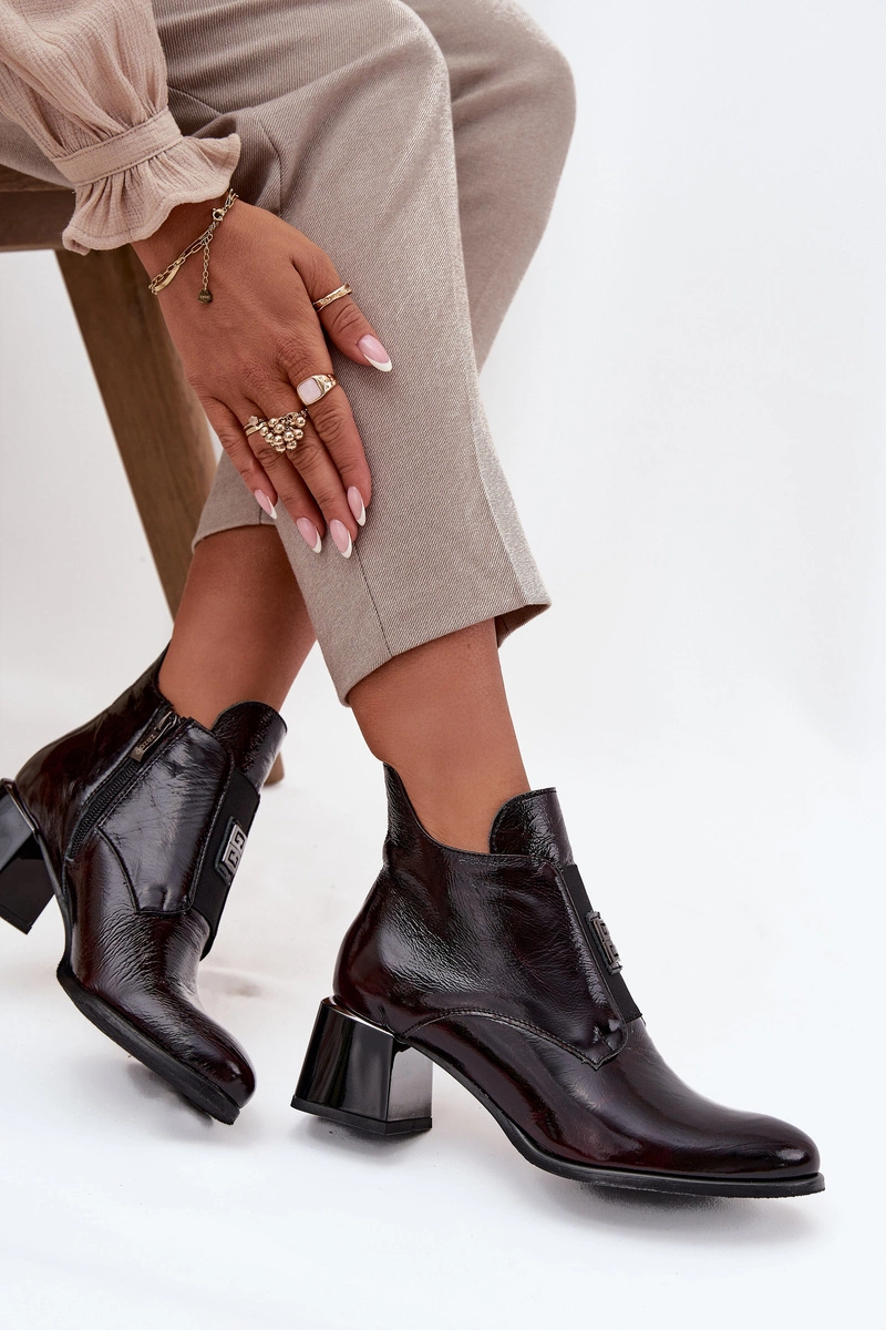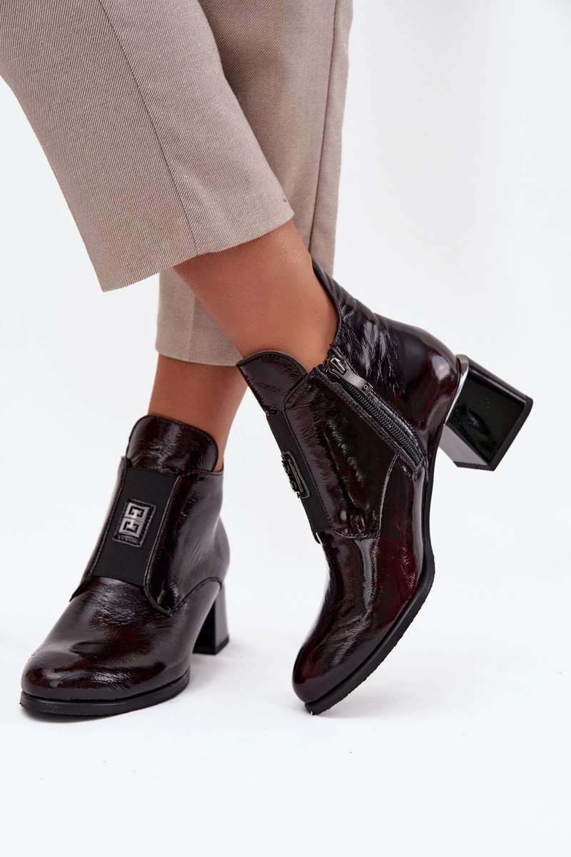 Skórzane Lakierowane Botki Na Klocku Z Ozdobnym Detalem Ocieplane Zazoo 60560 Bordowe