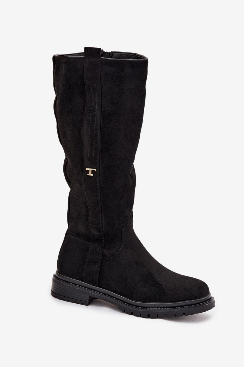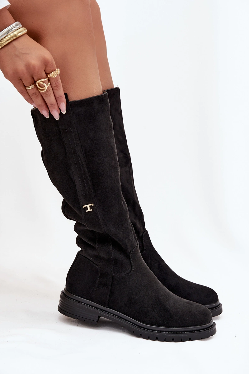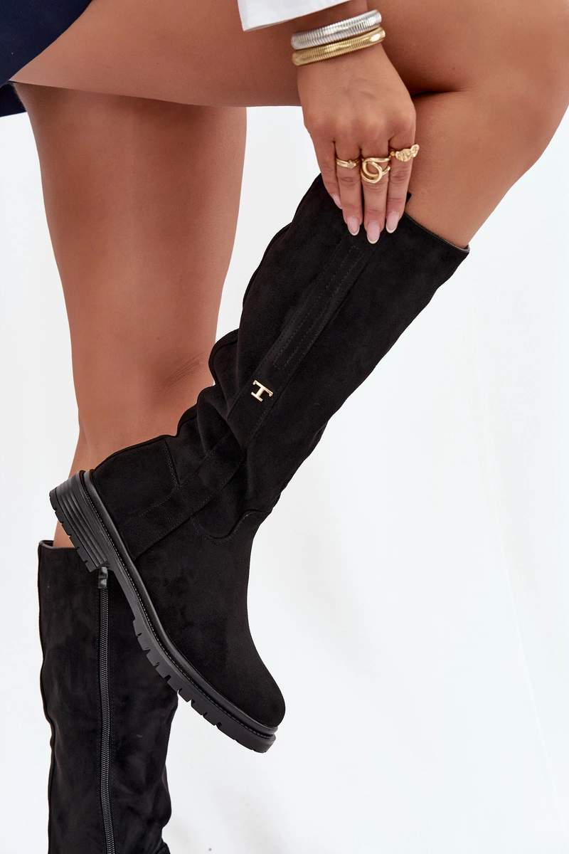 Kozaki Damskie Ocieplane Na płaskim Obcasie Eko Zamszowe Czarne Delyssa