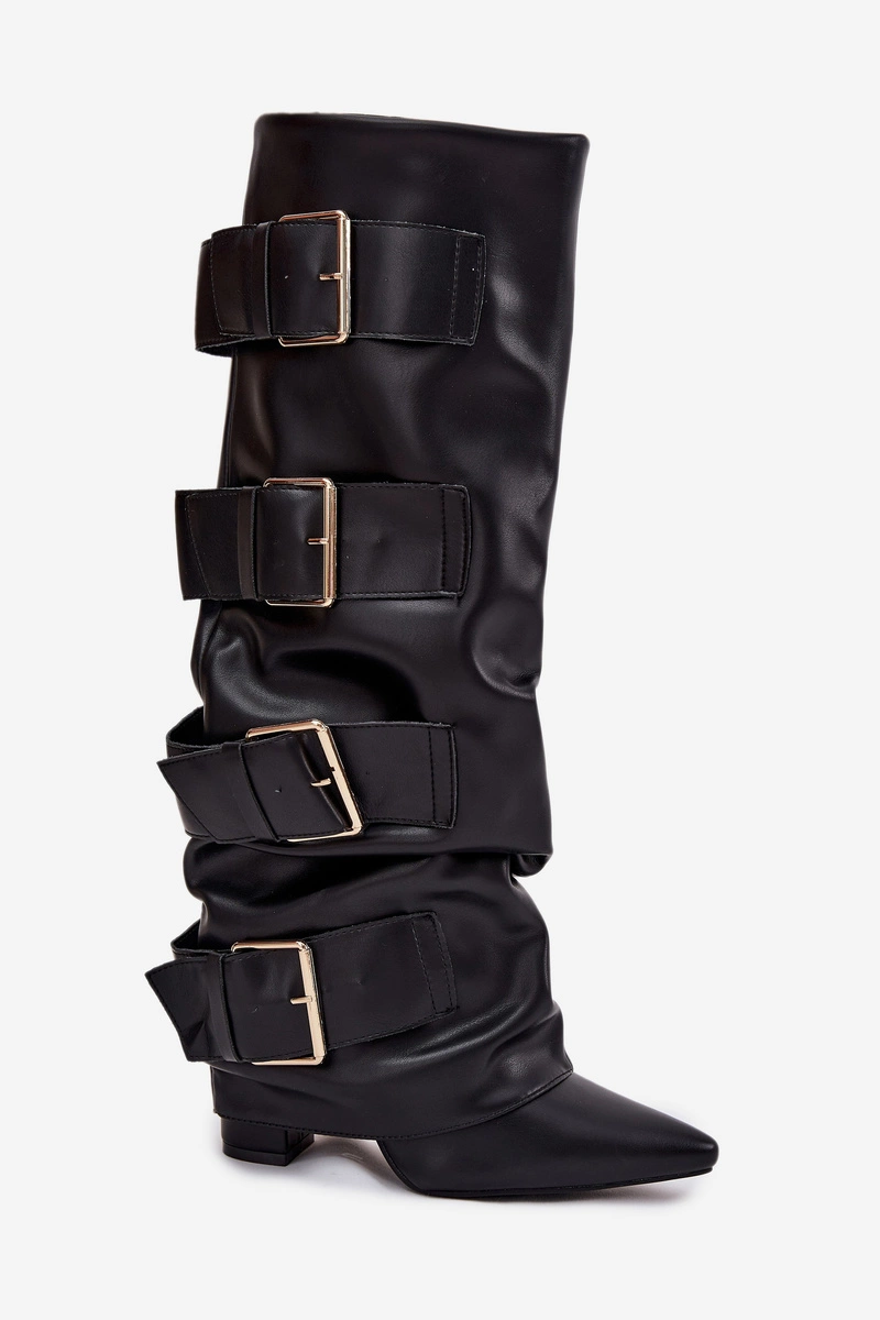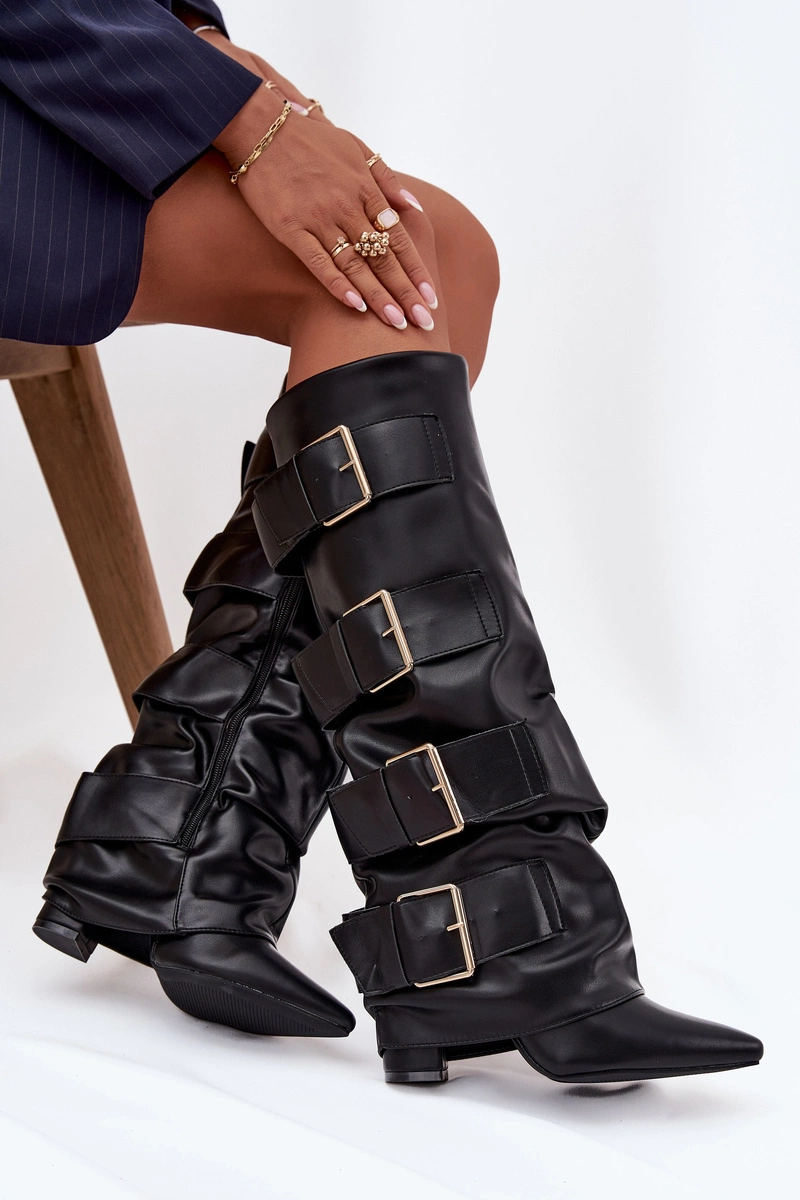 Kozaki Damskie Na Słupku Z Wywiniętą Cholewką I Złotymi Klamrami Czarne Isavelle