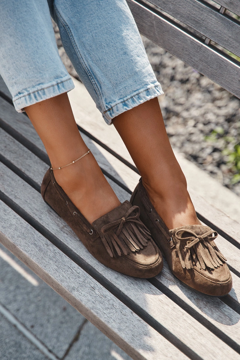 Damskie mokasyny z eko zamszu łączą wygodę z modnym stylem. Model wyróżnia się ozdobnymi frędzlami z kokardką, które dodają lekkości i charakteru, a zaokrąglone noski zapewniają komfort noszenia. Miękka wkładka z eko skóry gwarantuje wygodę nawet podczas dłuższego chodzenia, sprawiając, że mokasyny świetnie sprawdzą się w codziennych, casualowych stylizacjach. Przy wyborze rozmiaru prosimy sugerować się tabelą rozmiarów.