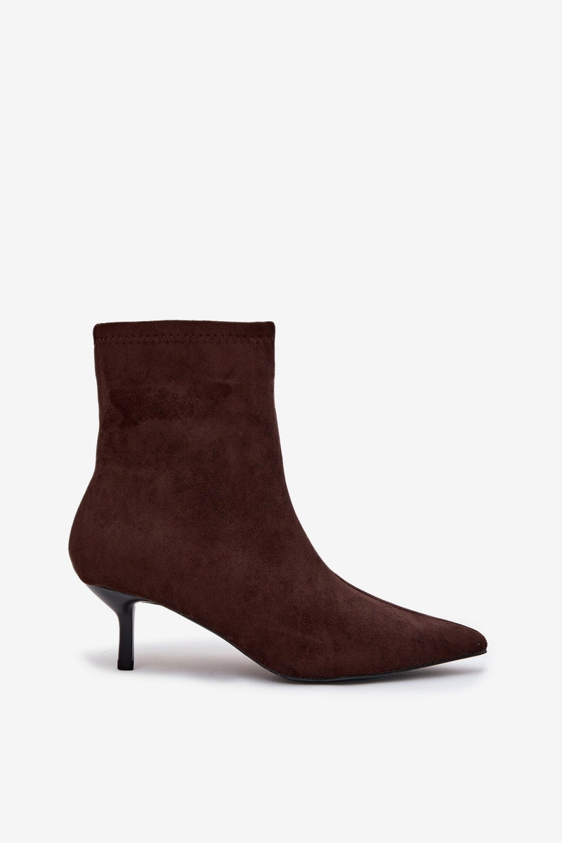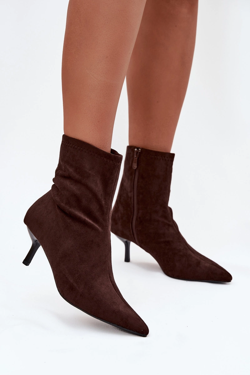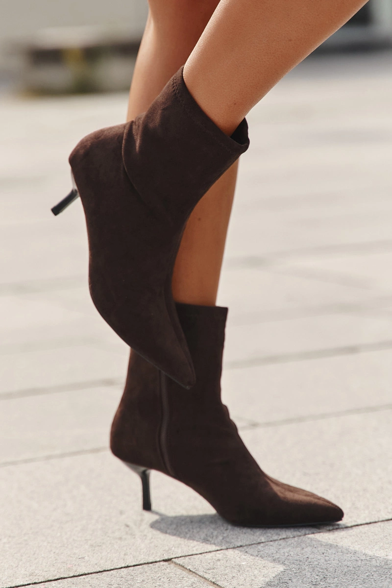 Eleganckie botki damskie wykonane z wysokiej jakości eko zamszu to idealny wybór na chłodniejsze dni. Smukła szpilka oraz szpiczasty nosek nadają butom wyjątkowo kobiecy i szykowny charakter, doskonale wysmuklając sylwetkę. Wewnętrzne ocieplenie zapewnia komfort i ciepło, dzięki czemu możesz cieszyć się modnym wyglądem również w sezonie jesienno-zimowym. Botki zapinane są na praktyczny zamek, który ułatwia zakładanie i zdejmowanie obuwia. Stylowy fason sprawia, że świetnie komponują się zarówno z sukienką, jak i ulubionymi spodniami. Przy wyborze rozmiaru prosimy sugerować się tabelą rozmiarów.