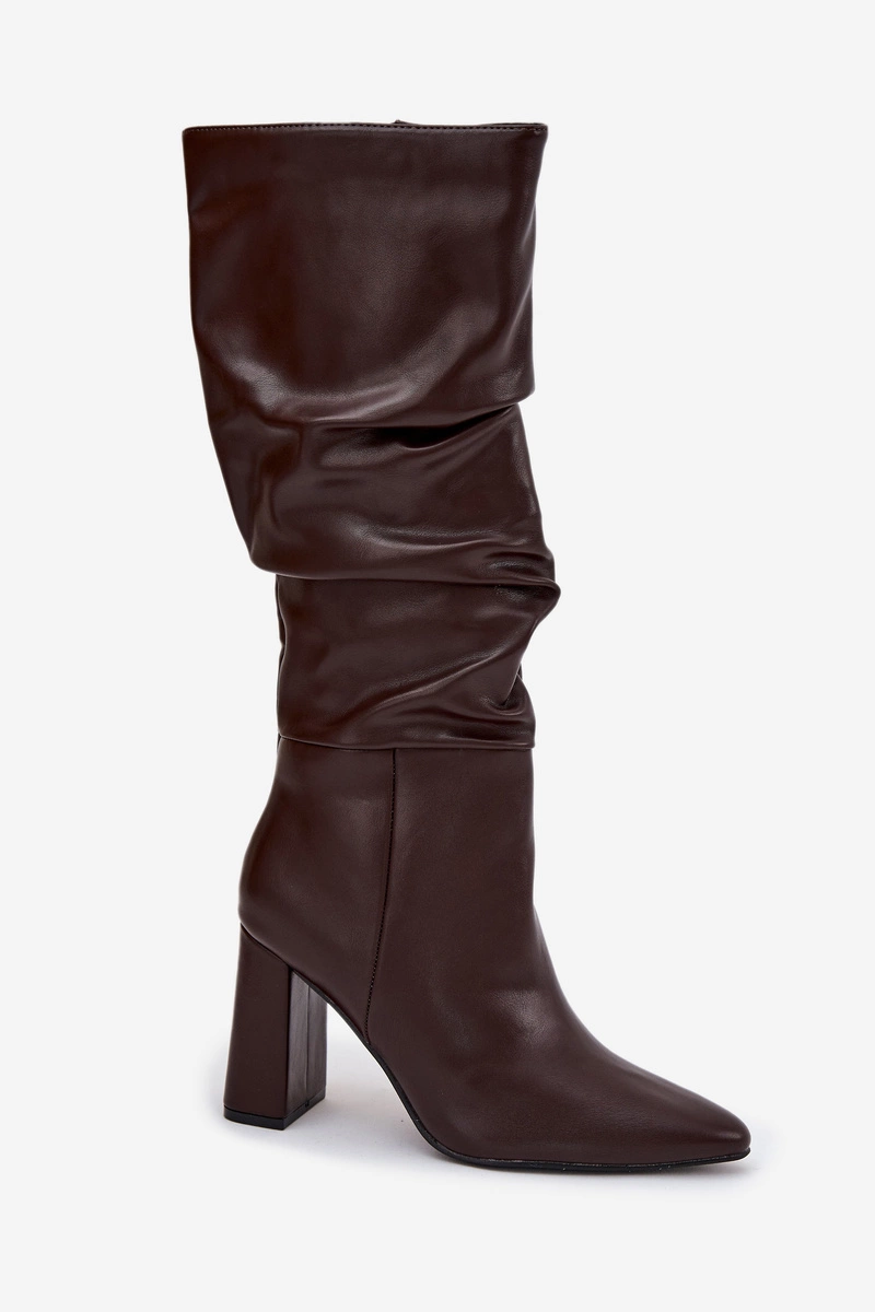 Kozaki damskie wykonane z eko skóry. Stabilny obcas typu słupek zapewnia komfort chodzenia, a noski w kształcie migdała dodają klasycznego charakteru. Marszczona cholewka nadaje modnego i niebanalnego wyglądu, dzięki czemu świetnie wyróżniają się w stylizacji. Kozaki zapinane są na praktyczny zamek, co ułatwia ich zakładanie i zdejmowanie. Idealne zarówno do spodni, jak i sukienek – sprawdzą się w wielu codziennych oraz eleganckich outfitach. Przy wyborze rozmiaru prosimy sugerować się tabelą rozmiarów.
