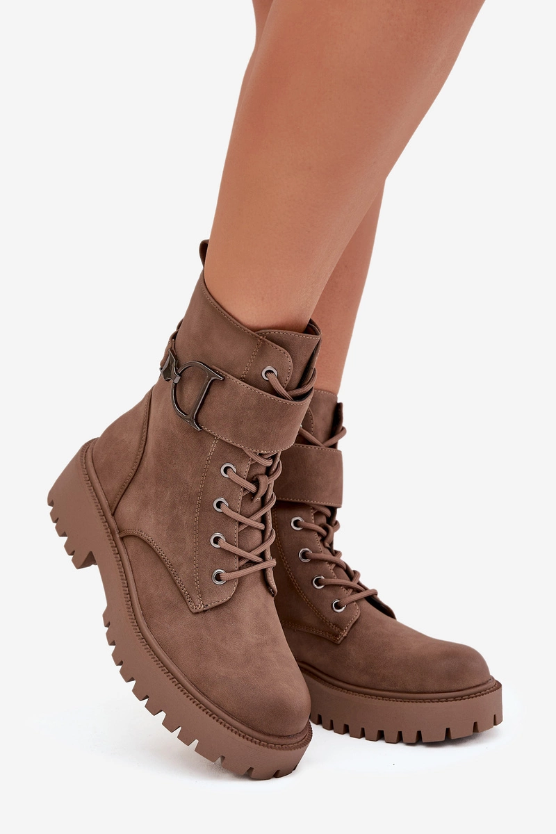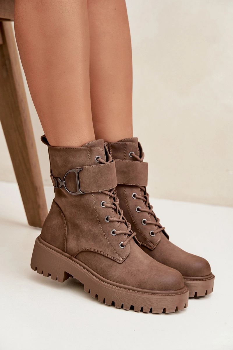 Botki Workery Damskie Z Ocieplane Z Ozdobnym Paskiem Ciemnobeżowe Ulivine