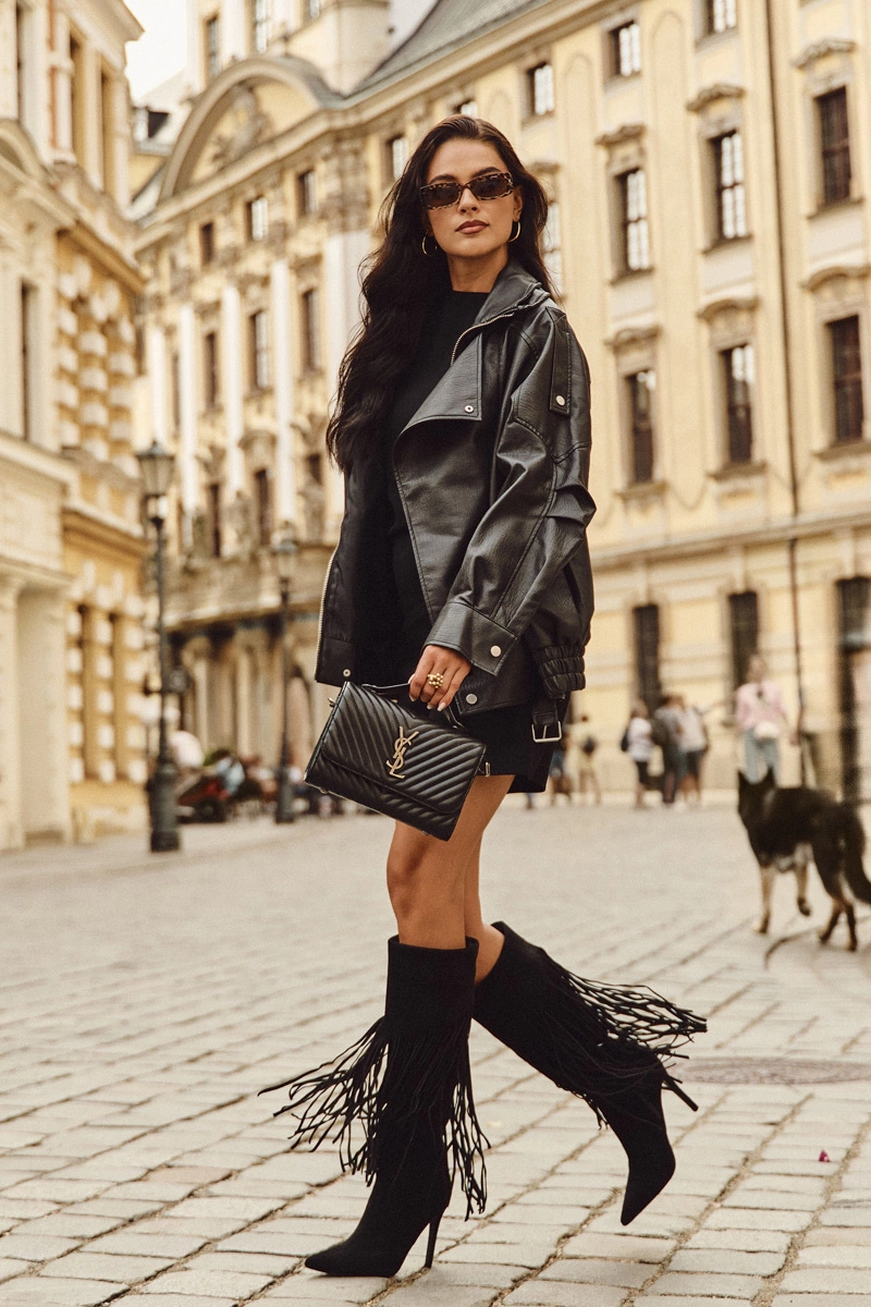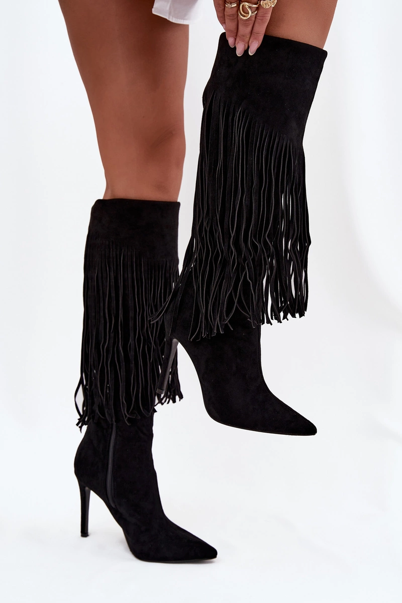 Kozaki Damskie Na Szpilce Z Frędzlami Czarne Isalune