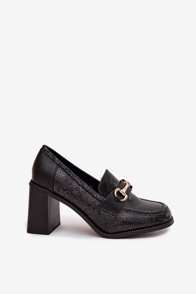 Półbuty Damskie Na Słupku Z Tłoczeniem I Złotym Detalem Czarne Novella