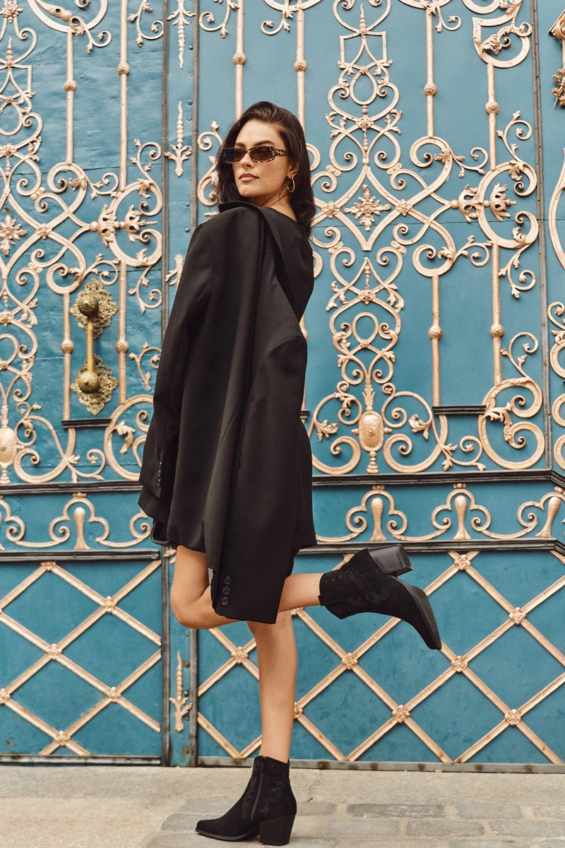 Botki kowbojki damskie wykonane z eko zamszu to modny model, który świetnie wpisuje się w aktualne trendy. Szpiczaste noski nadają im elegancji i wysmuklają sylwetkę, a ozdobne zdobienie podkreśla charakterystyczny, kowbojski styl. Model zapinany na praktyczny zamek jest wygodny w zakładaniu, a ocieplenie kocem obuwniczym zapewnia ciepło w chłodniejsze dni. Stylowy fason sprawia, że botki doskonale uzupełnią zarówno casualowe, jak i boho stylizacje. Przy wyborze rozmiaru prosimy sugerować się tabelą rozmiarów.