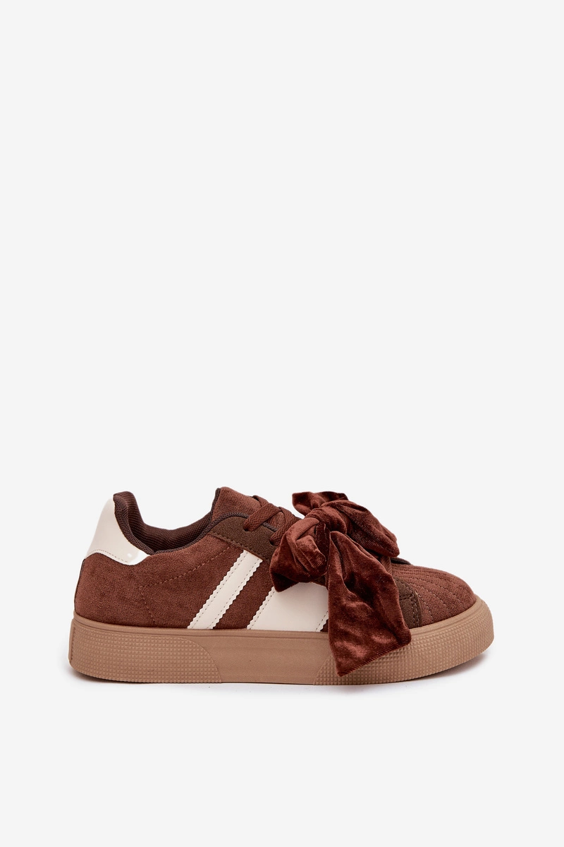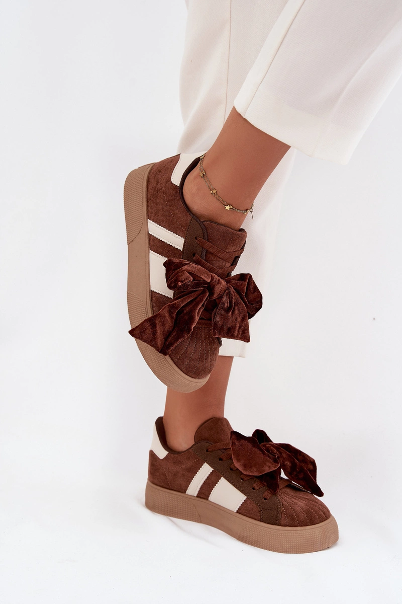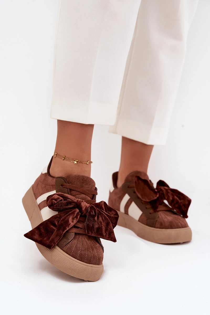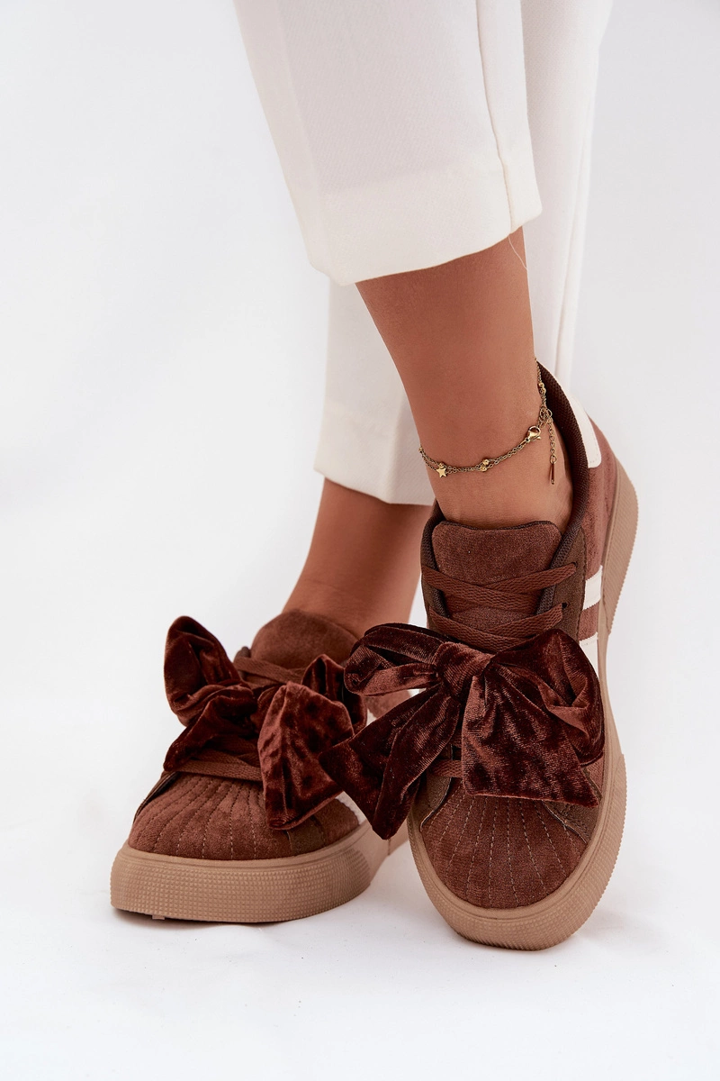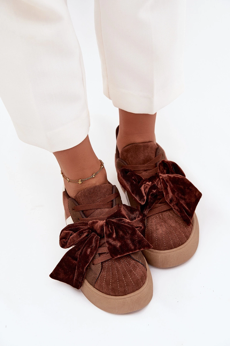 Sneakersy Damskie Z Welurową Kokardą Brązowe Ashlyn