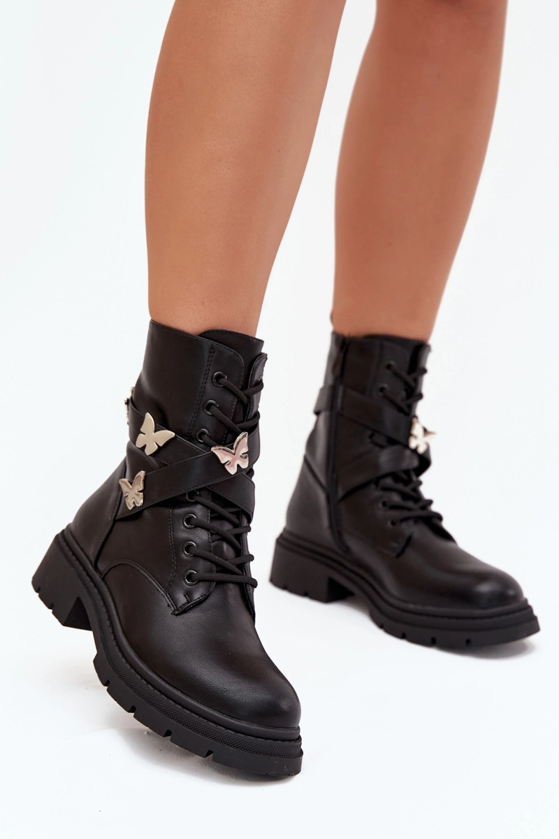Ocieplane Botki Workery Z Paskiem I Srebrnymi Przypinkami Czarne Kaelina
