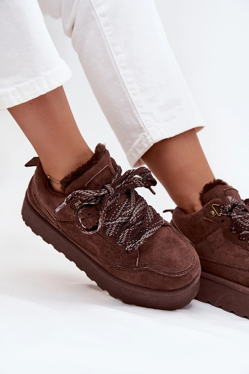 Sznurowane Śniegowce Damskie Na Platformie Ocieplane Futerkiem Brązowe Tavelle