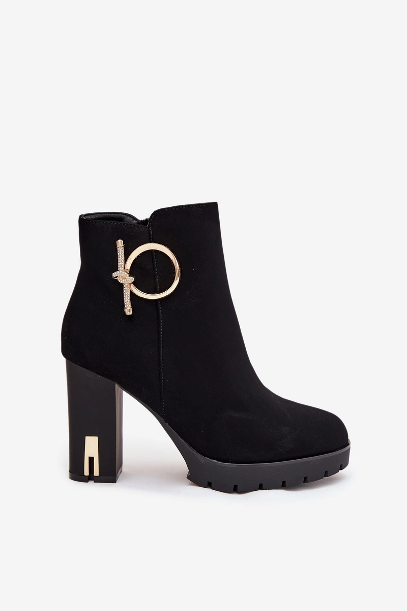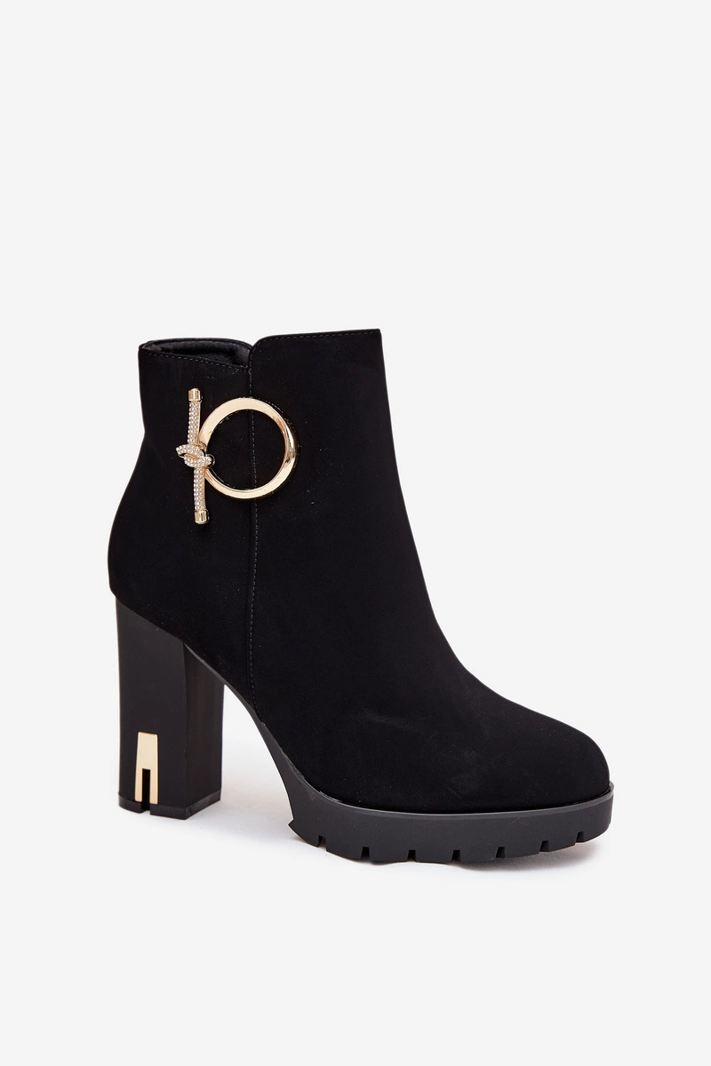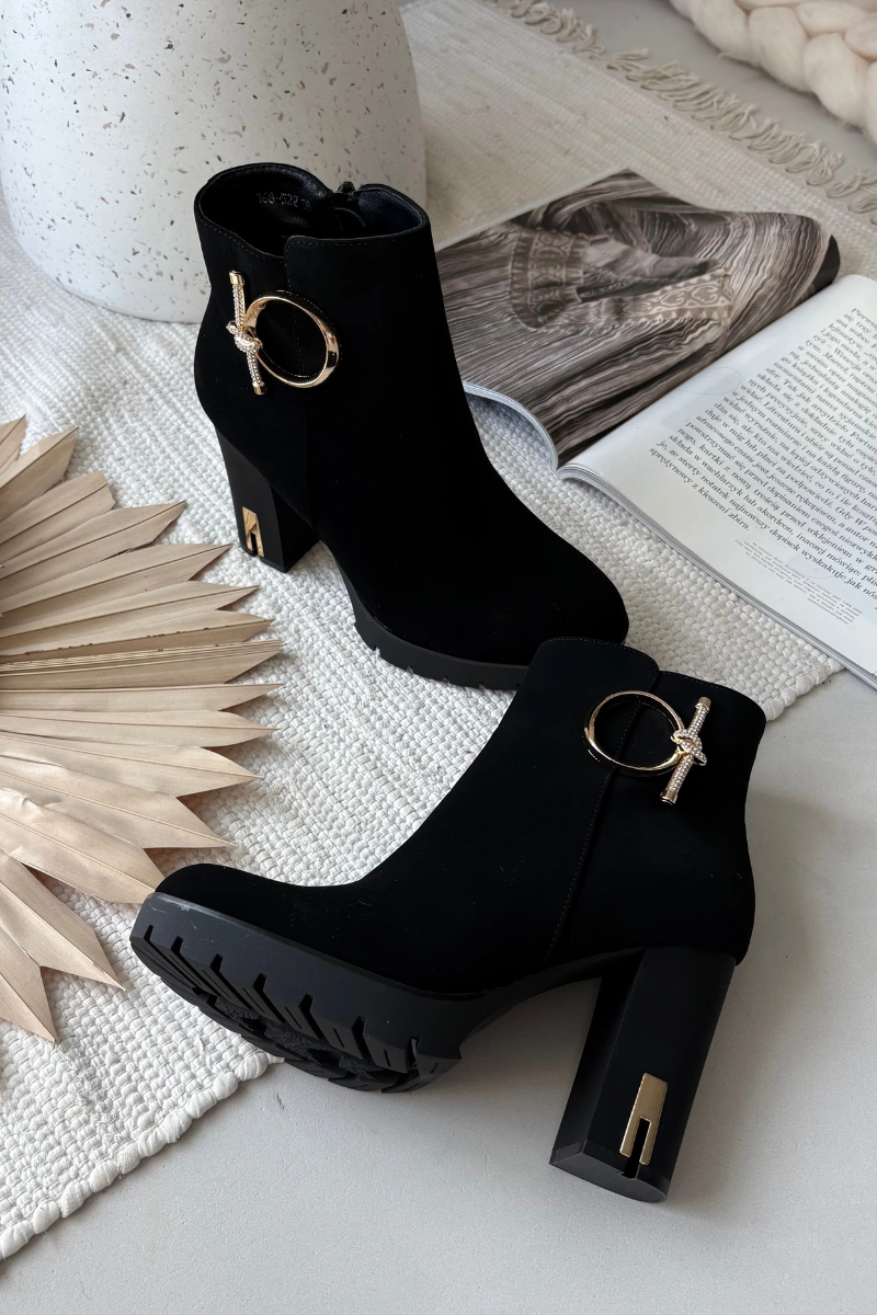 Botki Damskie Ocieplane Na Słupku Ze Złotą Ozdobą Czarne Ysolde