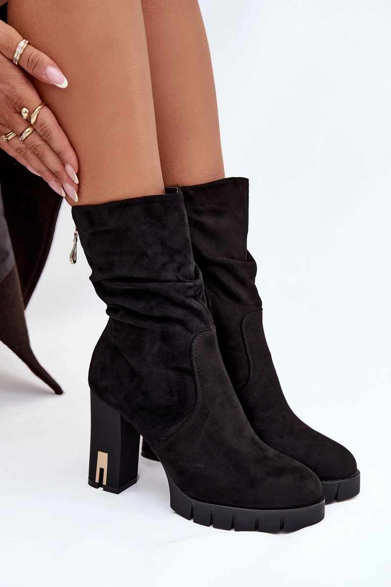 Ocieplane Botki Damskie Na Słupku Ze Złotym Zamkiem I Marszczeniem Czarne Briannae