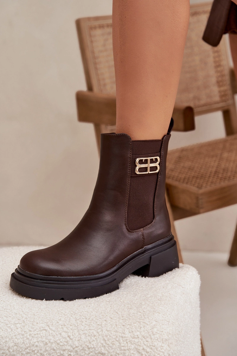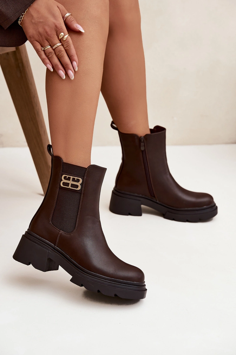 Botki Sztyblety Damskie Ze Złotym Detalem Ocieplane Brązowe Serene