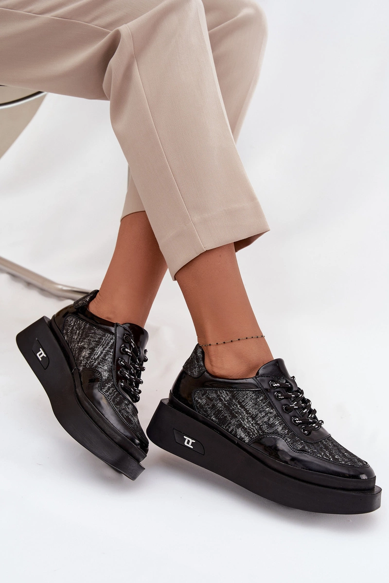 Skórzane Sznurowane Półbuty Damskie Na Platformie Artiker 57C2043 Czarno-Srebrne