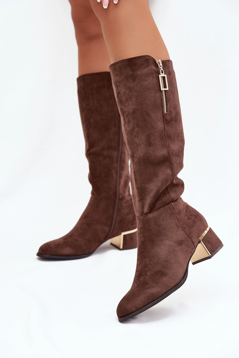 Kozaki Damskie Na Obcasie Z Eko Zamszu Brązowe Lyvienne