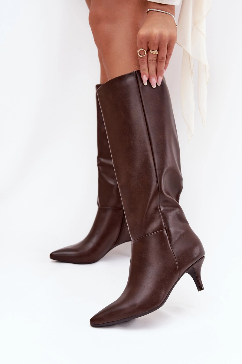 Kozaki Damskie Na Niskiej Szpilce Ocieplane Z Eko Skóry Czekoladowe Marcellia