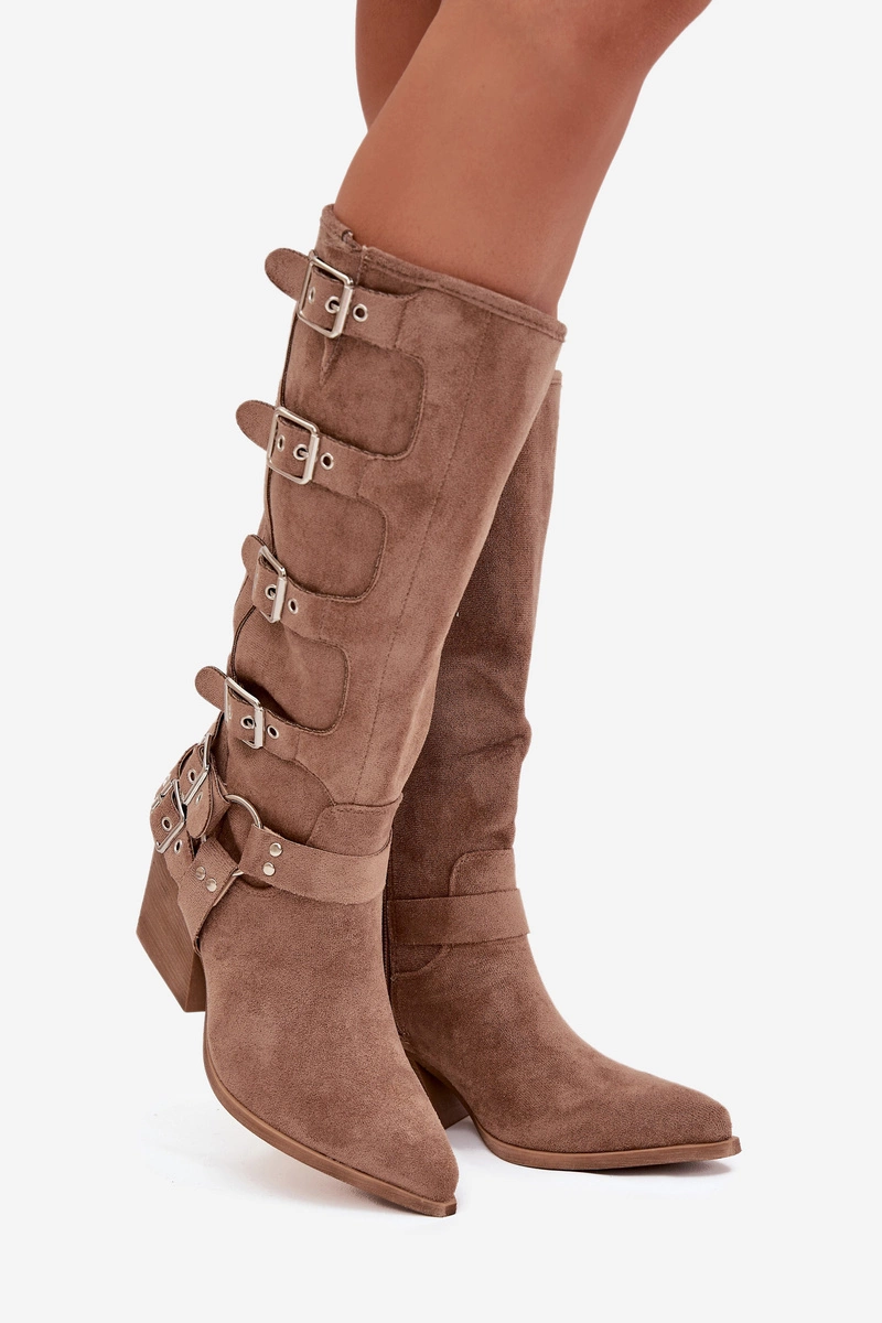 Kozaki Kowbojki Na Słupku Z Klamrami Ciemnobeżowe Fivelle