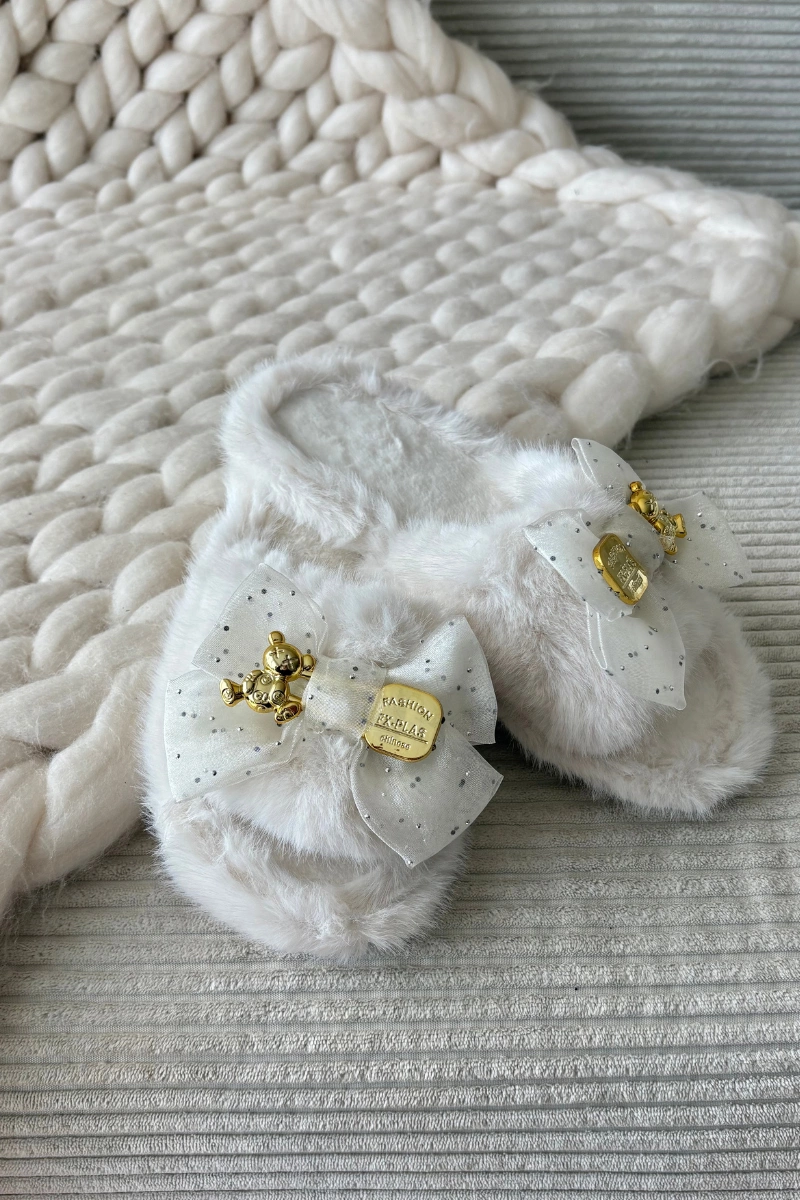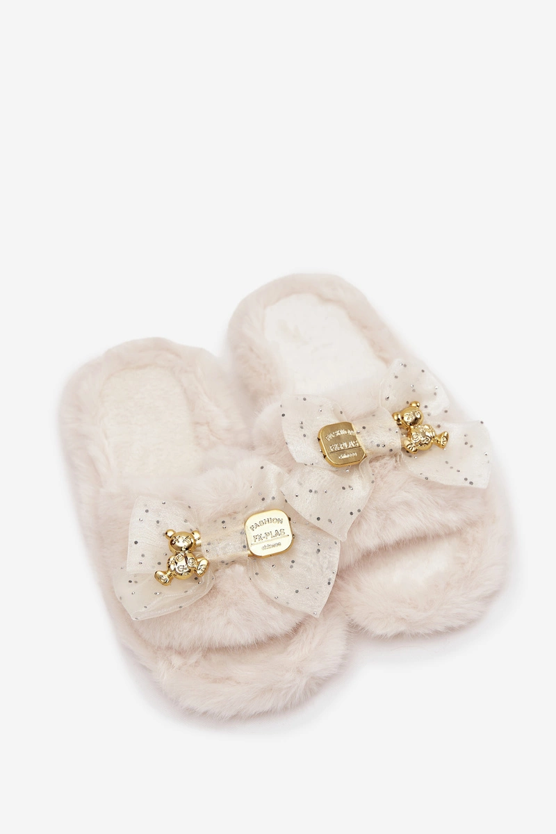 Futrzane Kapcie Damskie Z Kokardą I Złotą Ozdobą Jasnobeżowe Nolara
