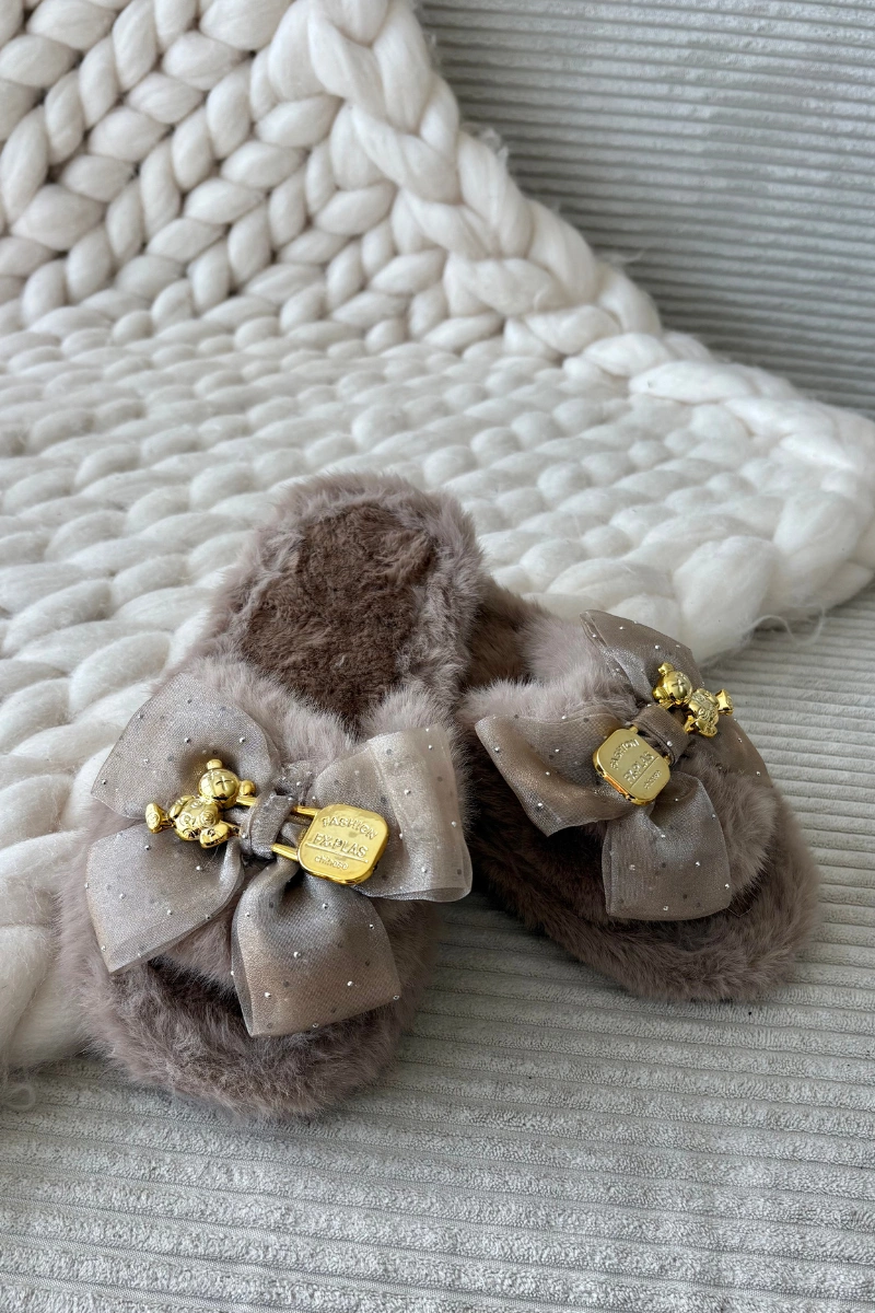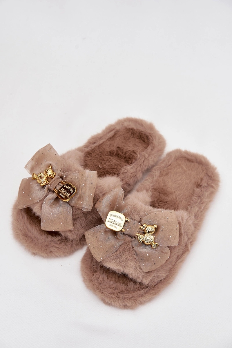 Futrzane Kapcie Damskie Z Kokardą I Złotą Ozdobą Ciemnobeżowe Nolara