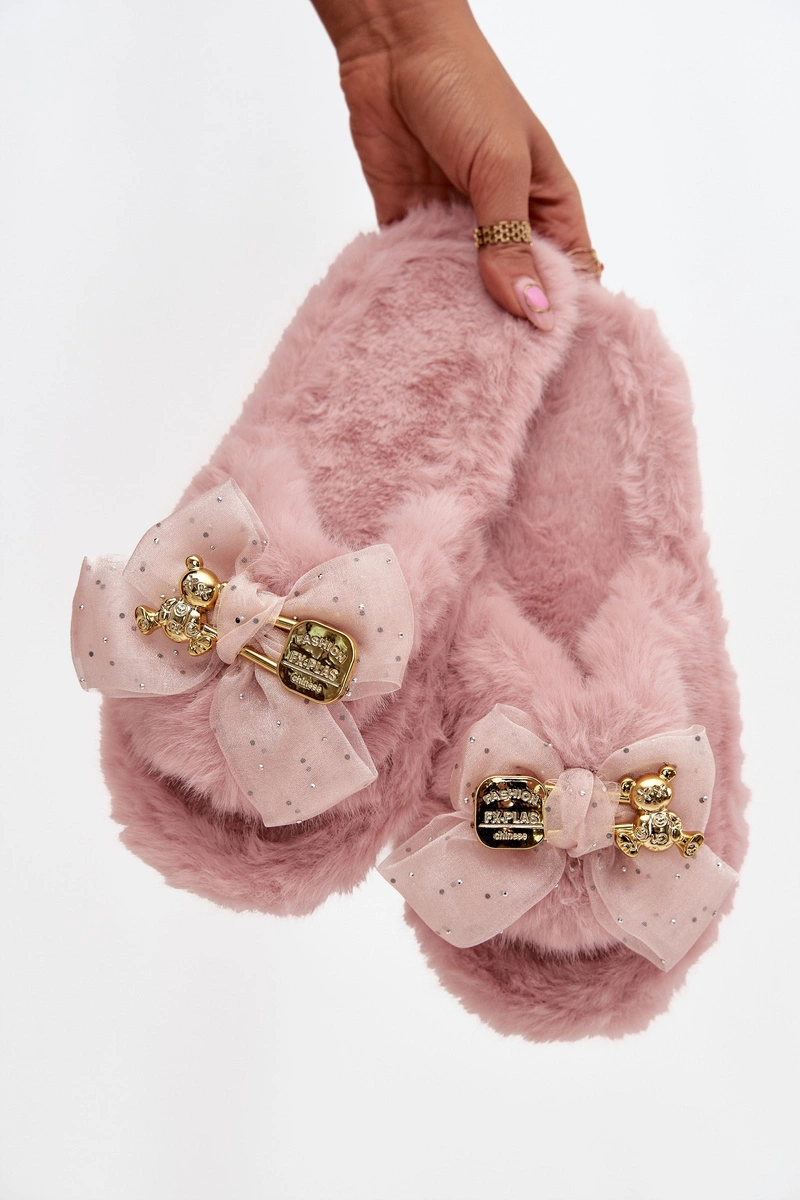 Futrzane Kapcie Damskie Z Kokardą I Złotą Ozdobą Różowe Nolara