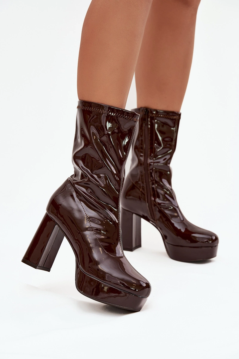 Lakierowane Botki Damskie Na Platformie I Słupkowym Obcasie Czekoladowe Calvessa