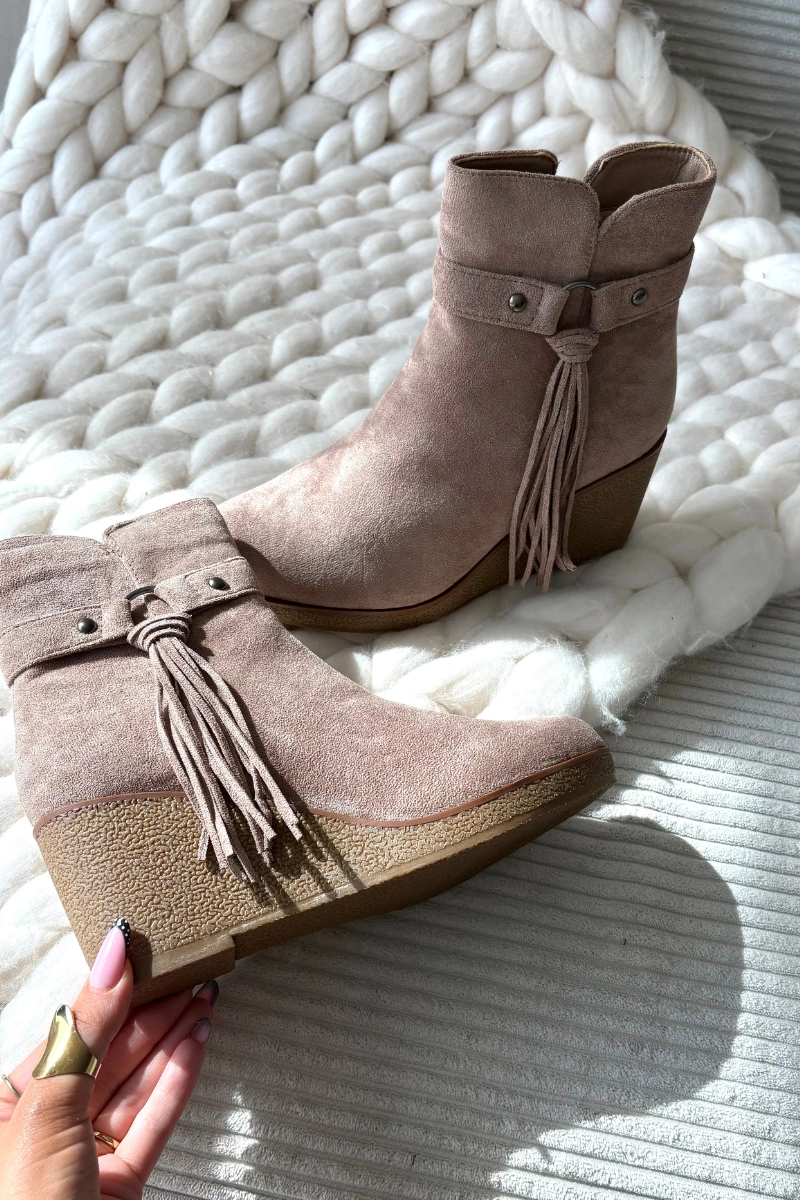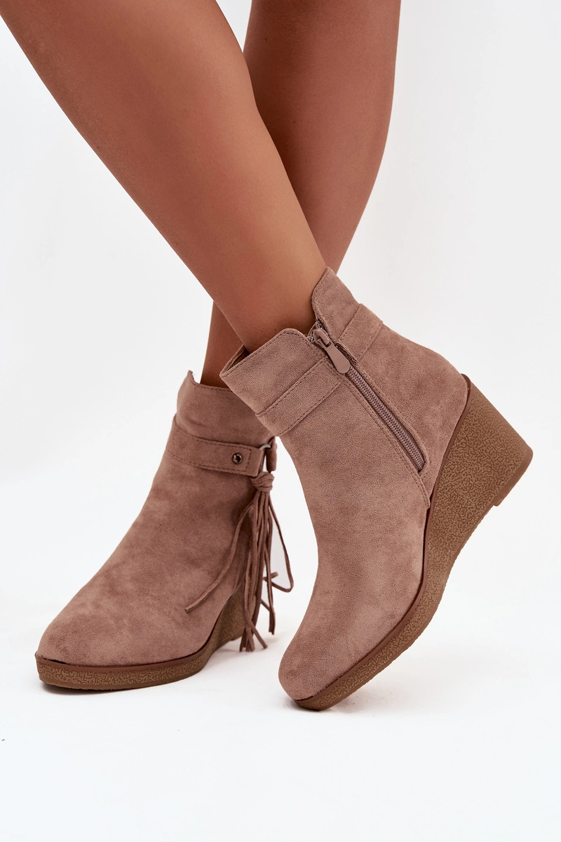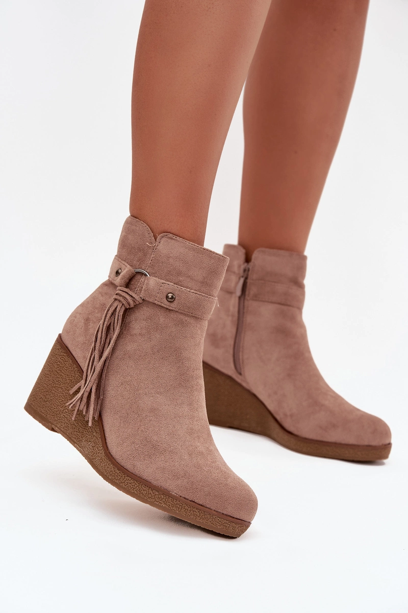 Ocieplane Botki Damskie Na Koturnie Z Frędzlami Beżowe Olivarae
