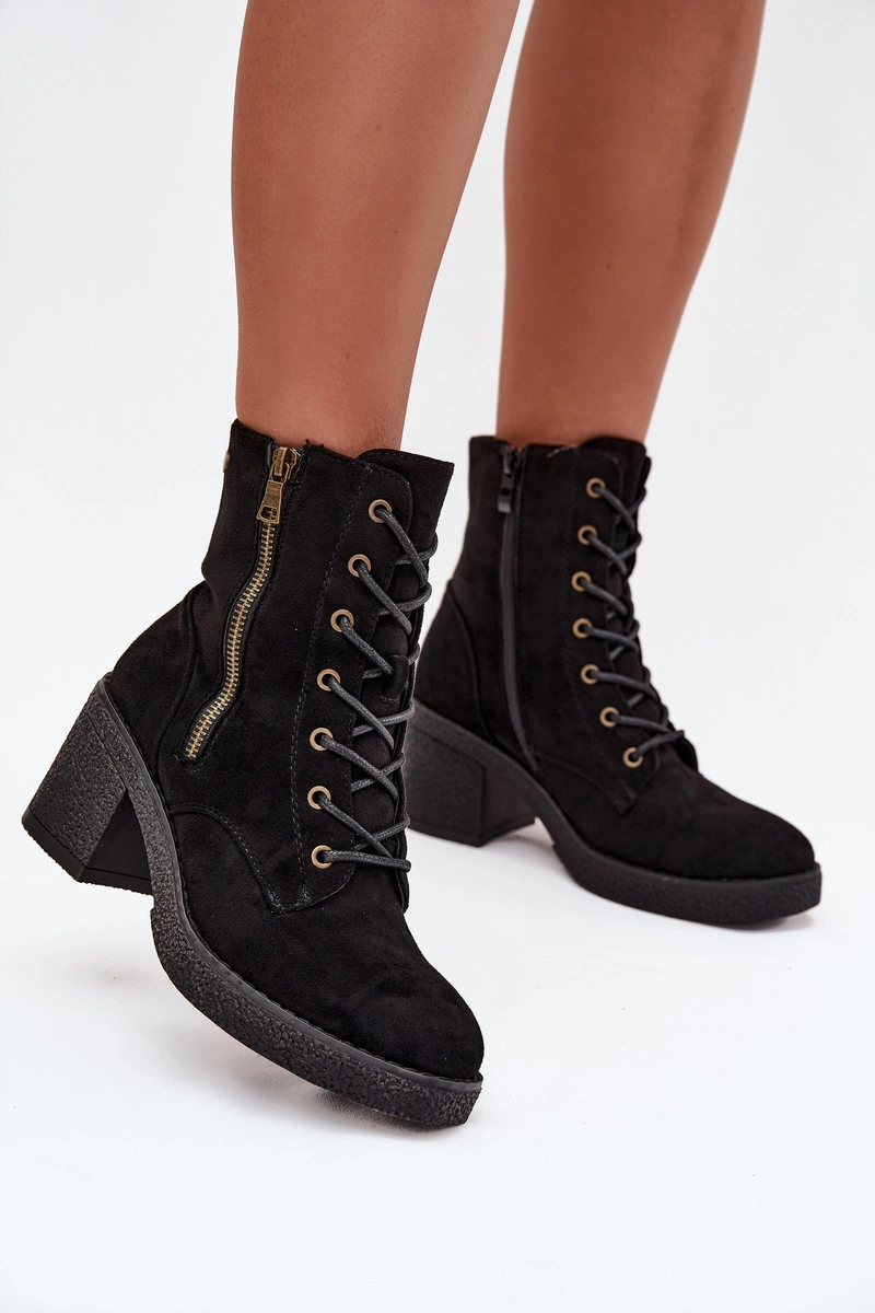Botki damskie wykonane z eko zamszu. Osadzone na stabilnym obcasie typu słupek, subtelnie podkreślają sylwetkę, a dzięki sznurowaniu można je idealnie dopasować do stopy. Posiadają zapięcie na zamek, co ułatwia zakładanie oraz dodatkowy ozdobny suwak, który nadaje całości modnego charakteru. Wnętrze butów zostało ocieplone kocem obuwniczym, co gwarantuje komfort termiczny w chłodniejsze dni. To idealny wybór do codziennych i casualowych stylizacji.