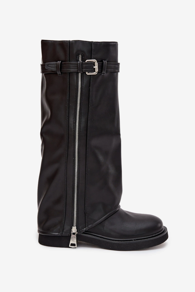 Kozaki Damskie Z Wywiniętą Cholewką Klamrą I Srebrnym Zamkiem Ocieplane Czarne Bressa