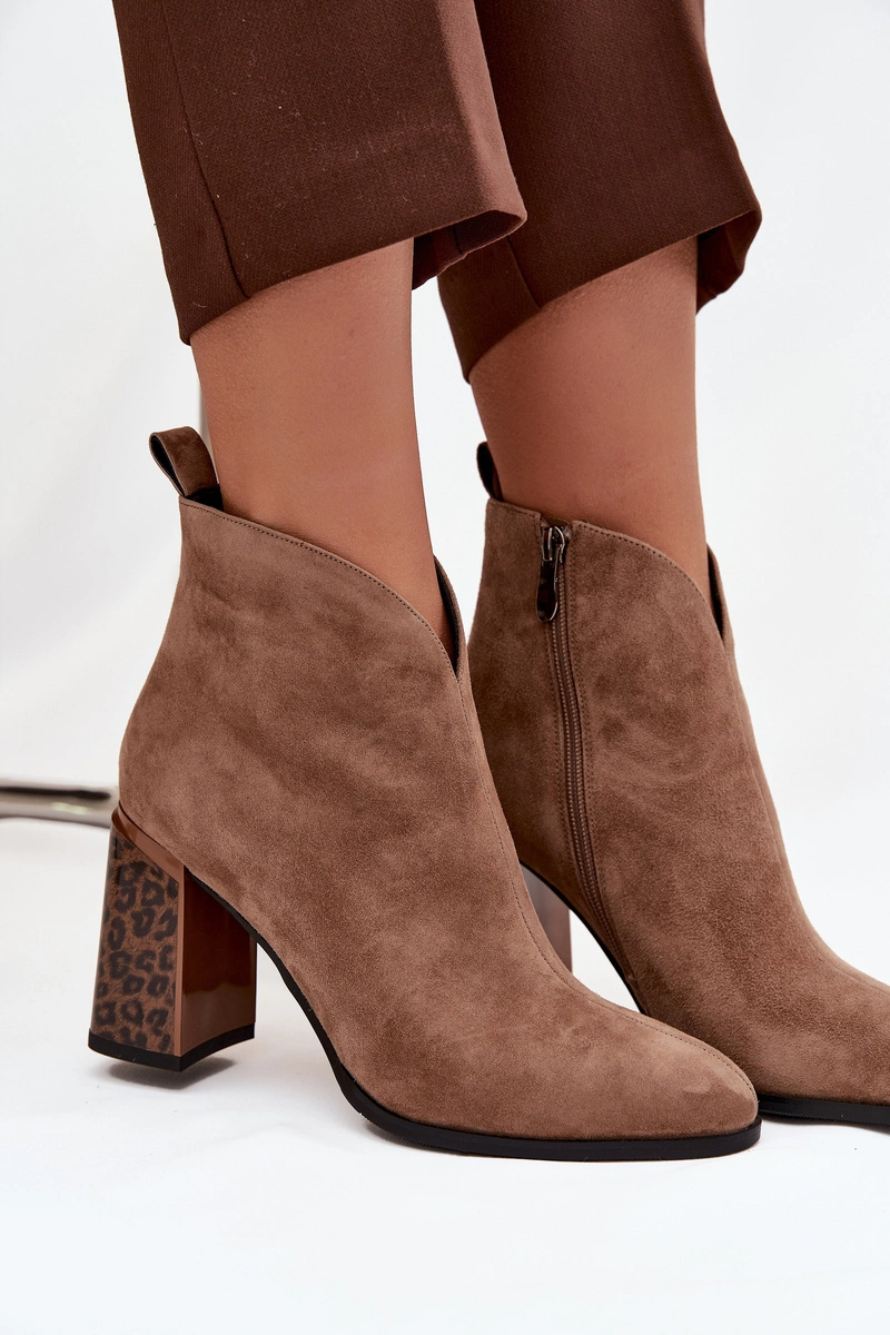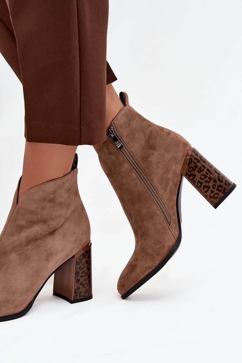 Botki damskie z naturalnego zamszu to propozycja łącząca klasykę z modnym akcentem. Zapinane na zamek, są wygodne w zakładaniu i zdejmowaniu. Osadzone na stabilnym obcasie typu słupek w panterkowy wzór, wyróżniają się oryginalnym wyglądem i przyciągają wzrok. Wnętrze butów zostało ocieplone kocem obuwniczym, co gwarantuje komfort i ciepło w chłodniejsze dni. Dodatkowym detalem jest przeszycie biegnące wzdłuż cholewki, które podkreśla elegancki charakter modelu. To botki idealne do jesiennych i zimowych stylizacji – świetnie sprawdzą się zarówno na co dzień, jak i w bardziej eleganckich zestawach.