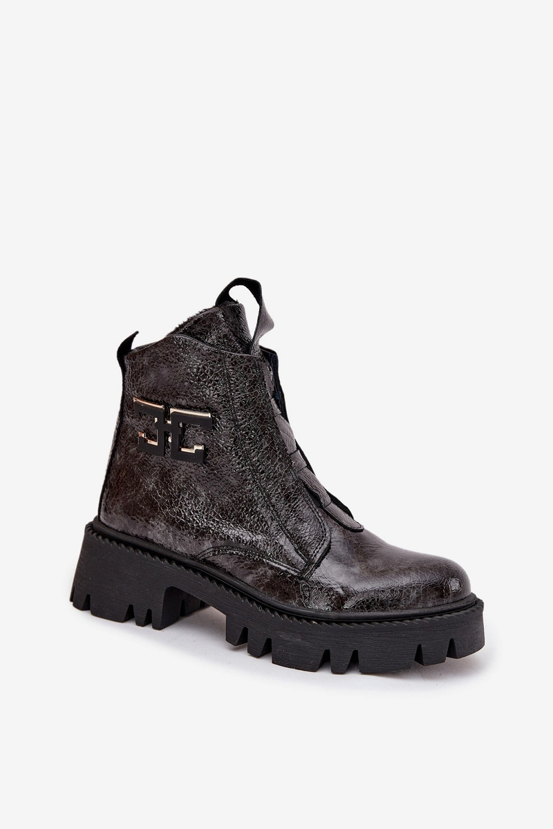 Skórzane Lakierowane Botki Damskie Z Ozdobą Ocieplane Artiker 57C2081 Grafitowe