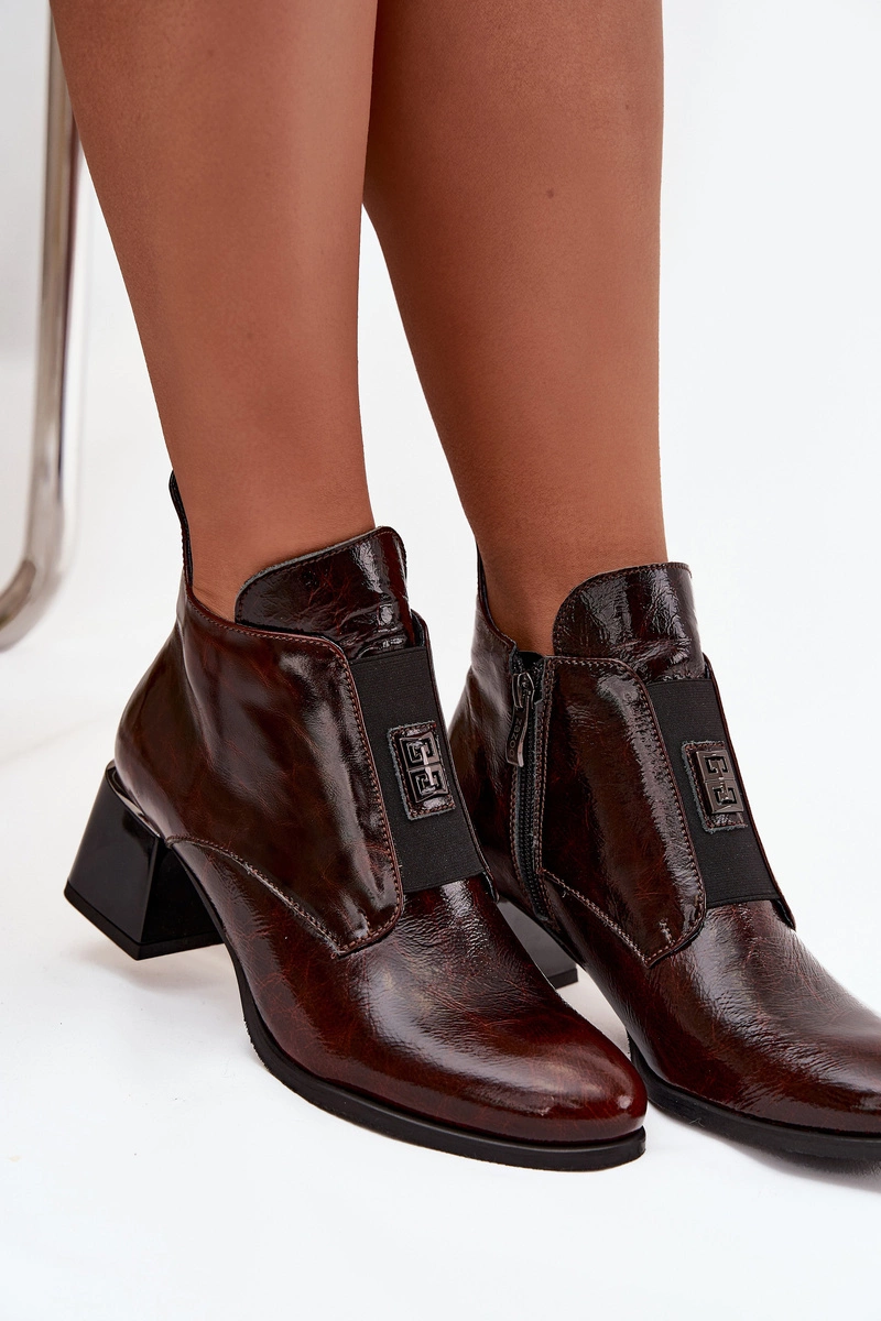Skórzane Lakierowane Botki Na Klocku Z Ozdobnym Detalem Ocieplane Zazoo 60560 Ciemnobrązowe