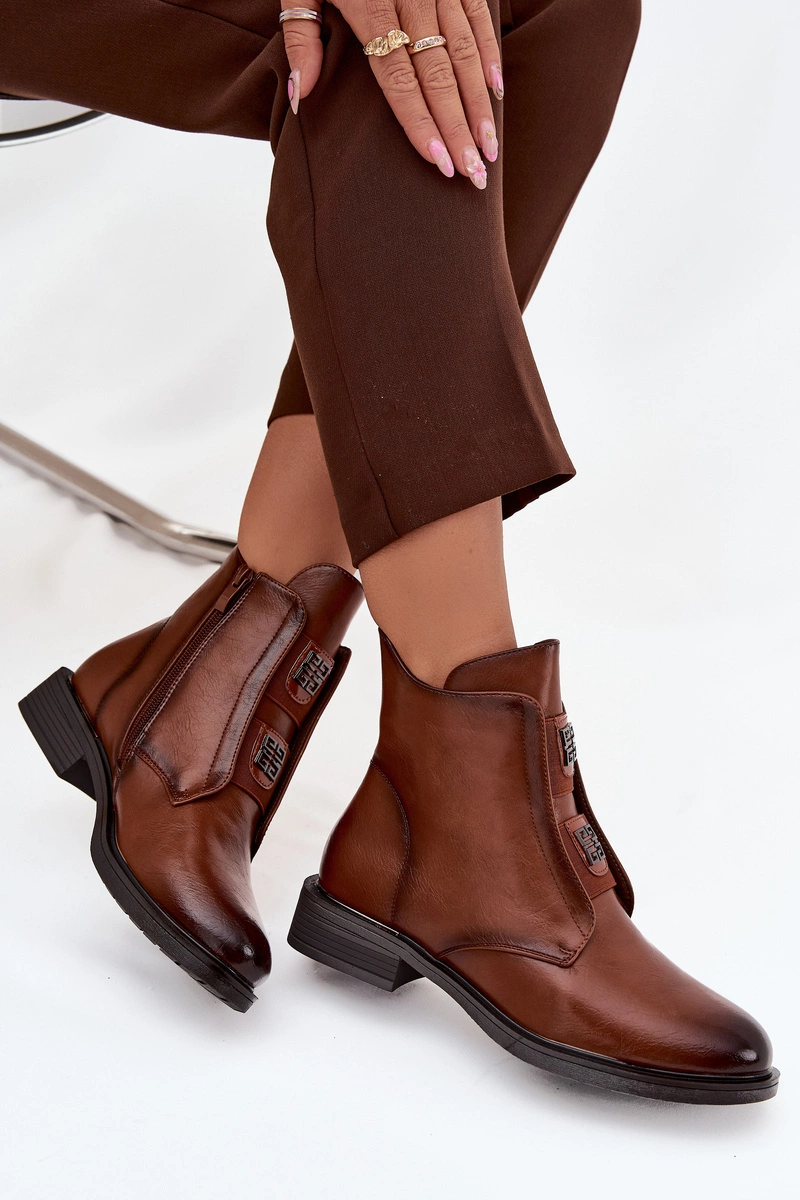 Botki damskie z eko skóry to wygodne i stylowe obuwie na chłodniejsze dni. Osadzone na niskim obcasie, zapewniają komfort podczas codziennego noszenia. Model zapinany na zamek jest praktyczny, a ocieplenie kocem obuwniczym gwarantuje ciepło i wygodę. Z przodu buty zdobią dwa ozdobne detale, które nadają im eleganckiego charakteru. Przy wyborze rozmiaru prosimy sugerować się tabelą rozmiarów.