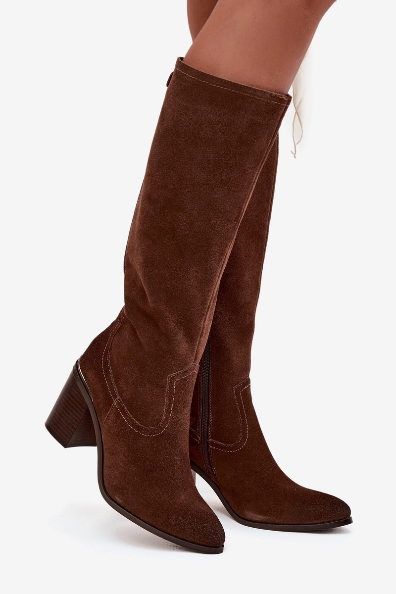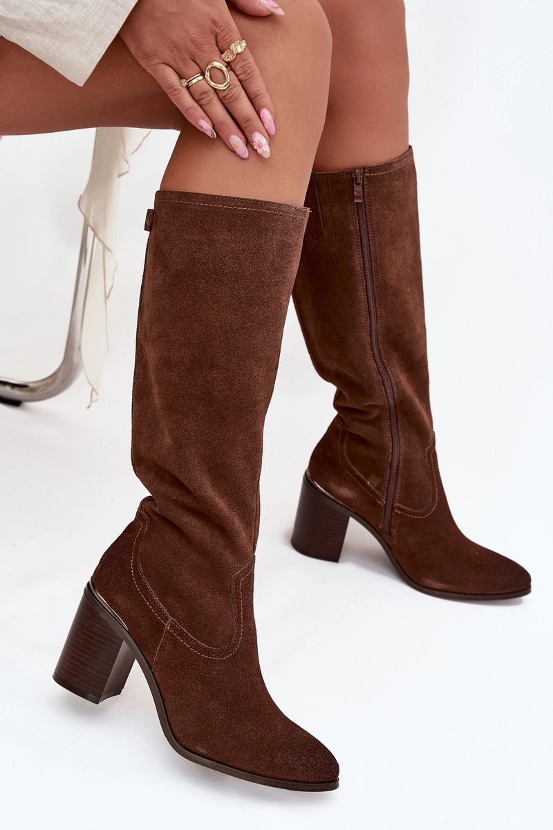 Kozaki damskie marki Sergio Leone wykonane z naturalnego zamszu to elegancka propozycja na chłodniejsze dni. Osadzone na stabilnym obcasie typu słupek, prezentują się szykownie i zapewniają wygodę. Migdałowe noski nadają im kobiecego charakteru, a ocieplenie kocem obuwniczym gwarantuje komfort i ciepło. Model zapinany na zamek jest praktyczny i świetnie sprawdzi się w jesienno-zimowych stylizacjach. Przy wyborze rozmiaru prosimy sugerować się tabelą rozmiarów.