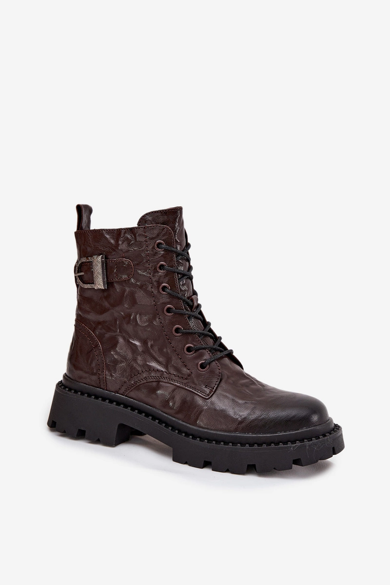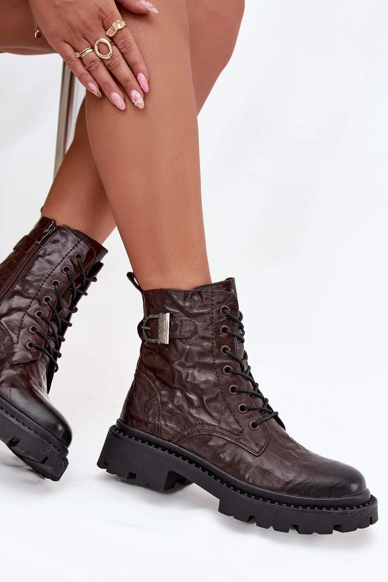 Skórzane Botki Damskie Z Efektem Marszczenia I Klamrą Artiker 57C1007 Czekoladowe