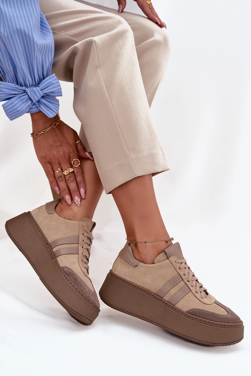 Skórzane Zamszowe Sneakersy Damskie Na Platformie Zazoo 3775 Beżowe