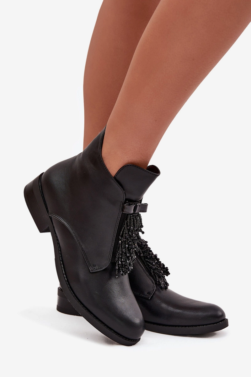 Botki damskie od marki S.Barski to propozycja łącząca wygodę z modnym, oryginalnym akcentem. Wykonane z wysokiej jakości eko skóry prezentują się elegancko, a jednocześnie są trwałe. Model osadzono na płaskim obcasie, co gwarantuje komfort i swobodę podczas codziennego użytkowania. Wnętrze zostało ocieplone miękkim materiałem, dzięki czemu buty doskonale sprawdzą się w chłodniejsze dni, zapewniając ciepło i wygodę. Uwagę przyciąga ozdobny detal z przodu w formie koralików, który dodaje całości wyjątkowego, kobiecego charakteru. Zapięcie na zamek ułatwia zakładanie i zdejmowanie obuwia. Świetnie sprawdzą się w stylizacjach z sukienkami, spódnicami i spodniami. Przy wyborze rozmiaru prosimy sugerować się tabelą rozmiarów.