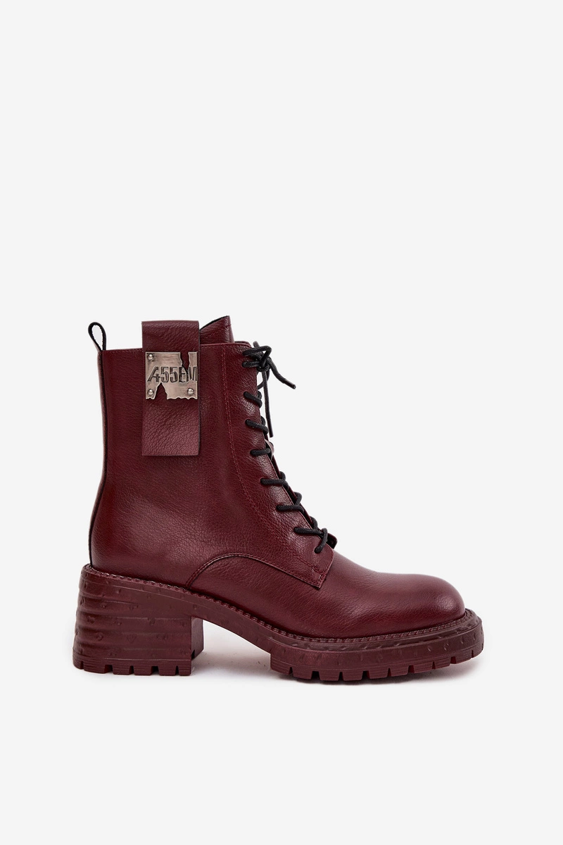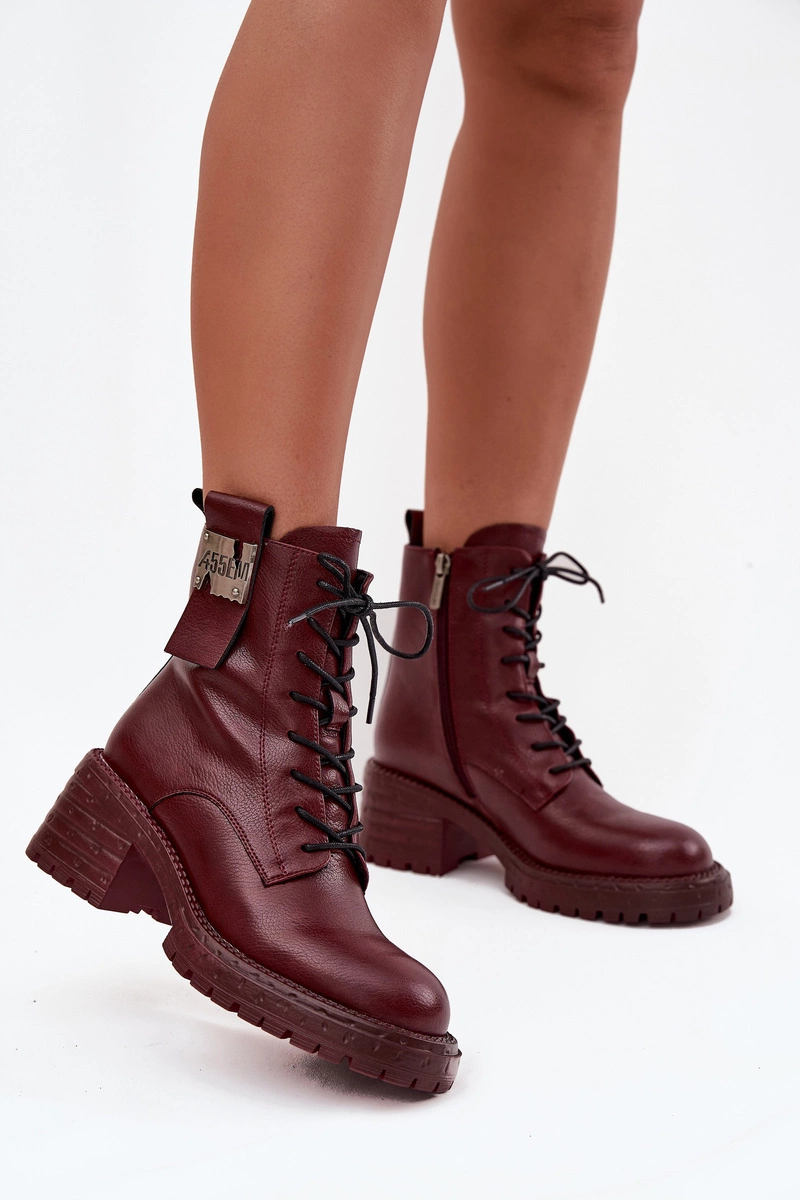 Skórzane Botki Workery Damskie Na Klocku Z Ozdobnym Detalem Artiker 57C0211 Bordowe