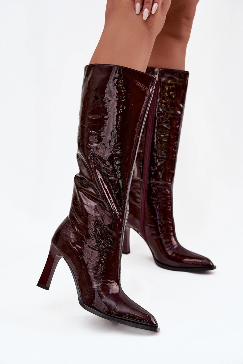 Skórzane Lakierowane Kozaki Damskie Ocieplane D&A CR52-716 Bordowe