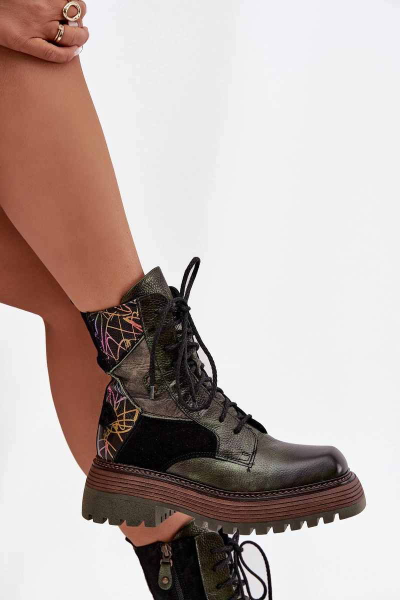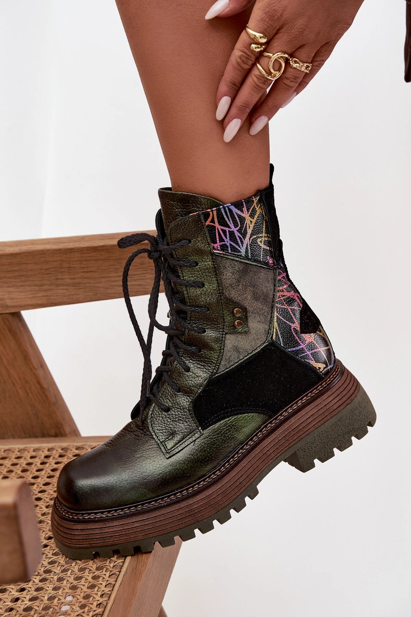 Skórzane Botki Damskie Na Platformie Maciejka 07104-09 Ciemnozielone