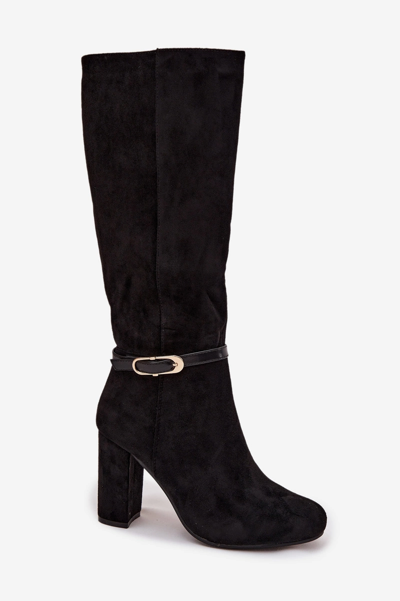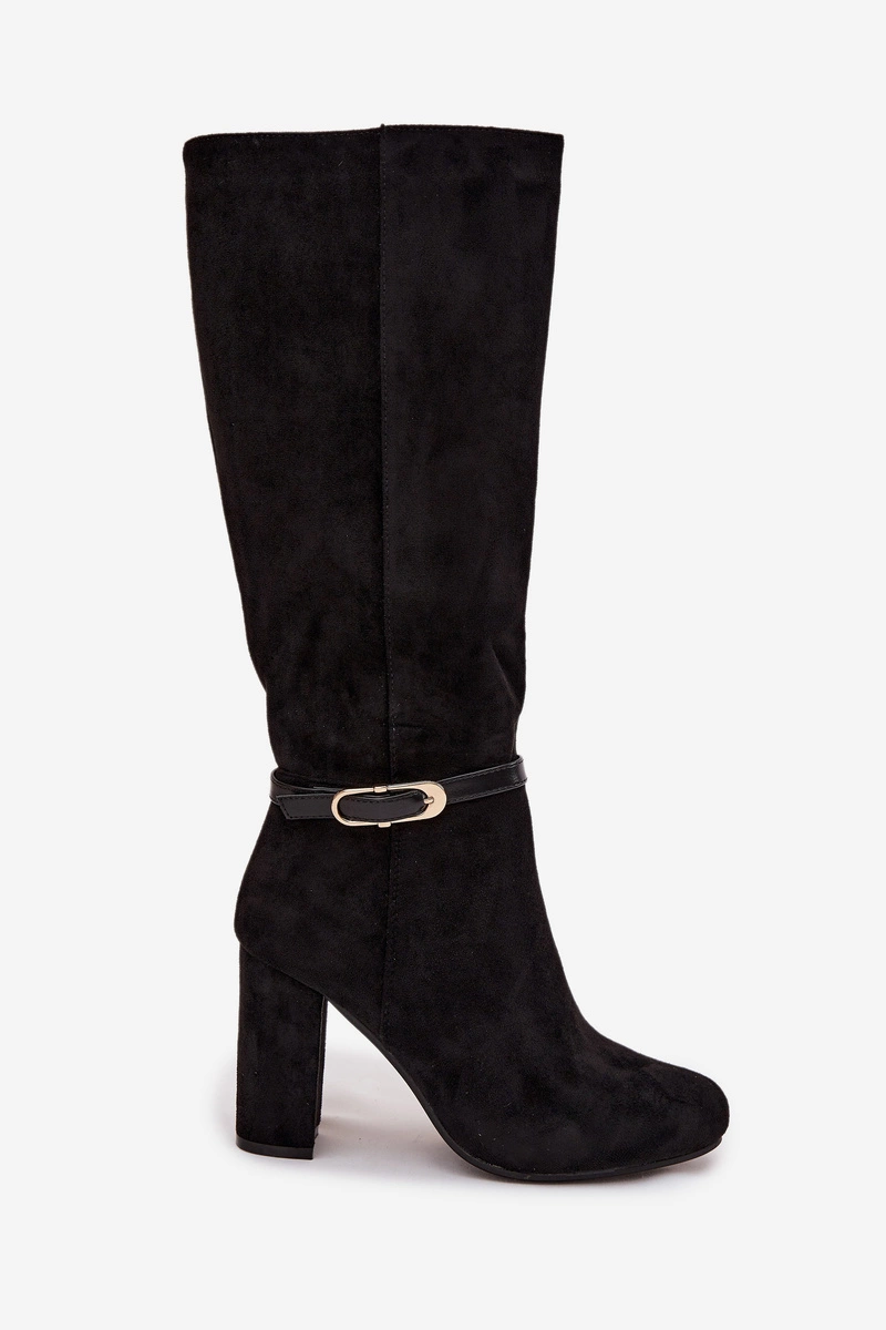 Kozaki Damskie Na Słupku Ze Złotą Klamrą Ocieplane Czarne Seraphine