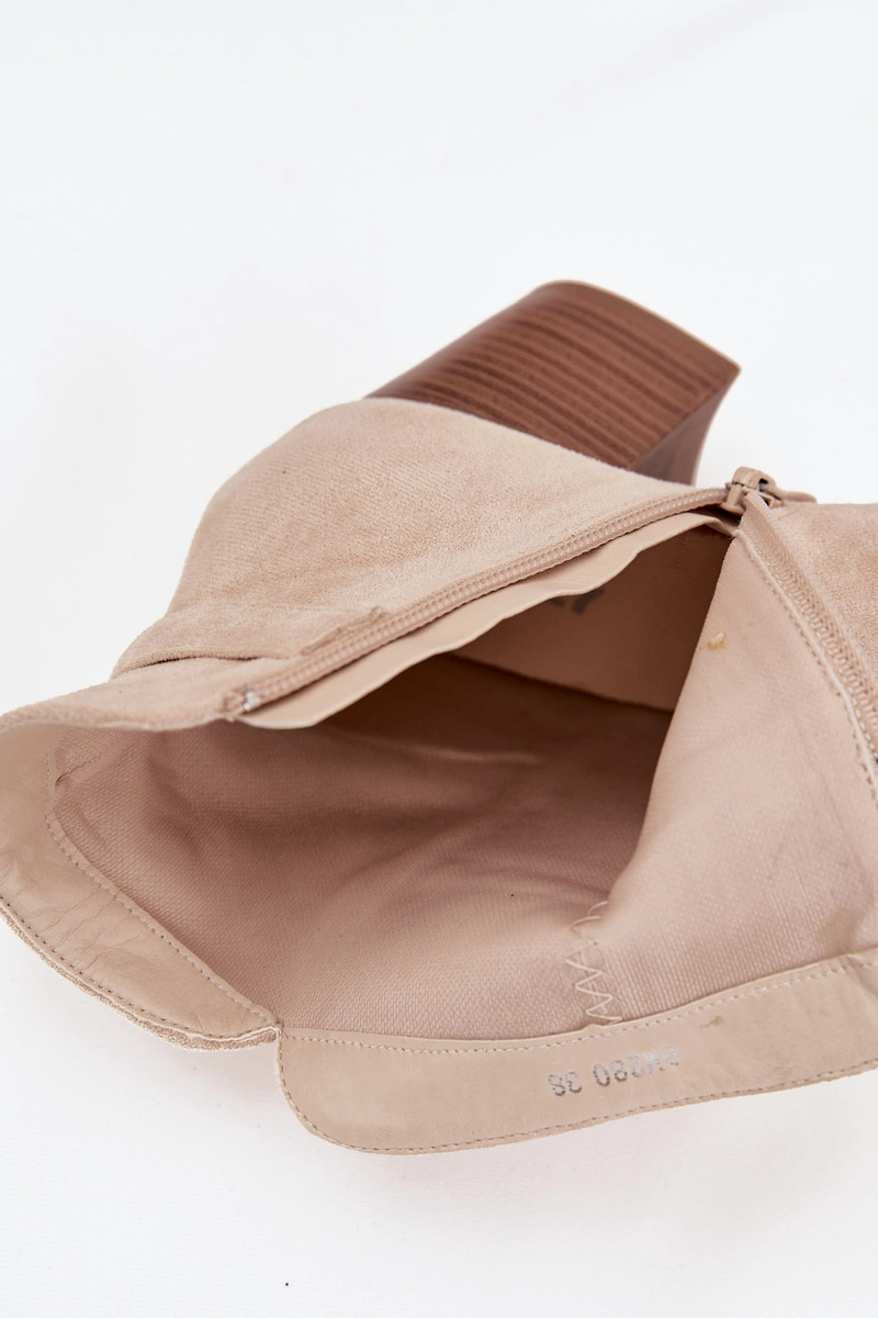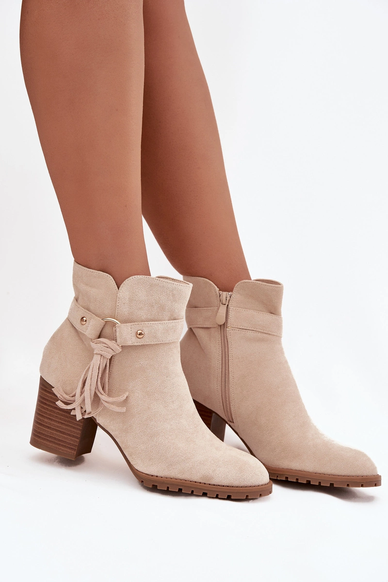 Botki damskie wykonane z eko zamszu. Klasyczny fason z zaokrąglonymi noskami został urozmaicony paskiem z frędzlami, nadającym butom oryginalności. Model osadzony na stabilnym obcasie typu słupek pięknie wysmukla sylwetkę, a jednocześnie zapewnia komfort podczas codziennego noszenia. Praktyczne zapięcie na zamek ułatwia zakładanie i zdejmowanie, dzięki czemu botki są wygodne w użytkowaniu. To obuwie, które doskonale sprawdzi się w sezonie jesienno-zimowym, stanowiąc stylowe dopełnienie zarówno casualowych, jak i bardziej eleganckich zestawów.
