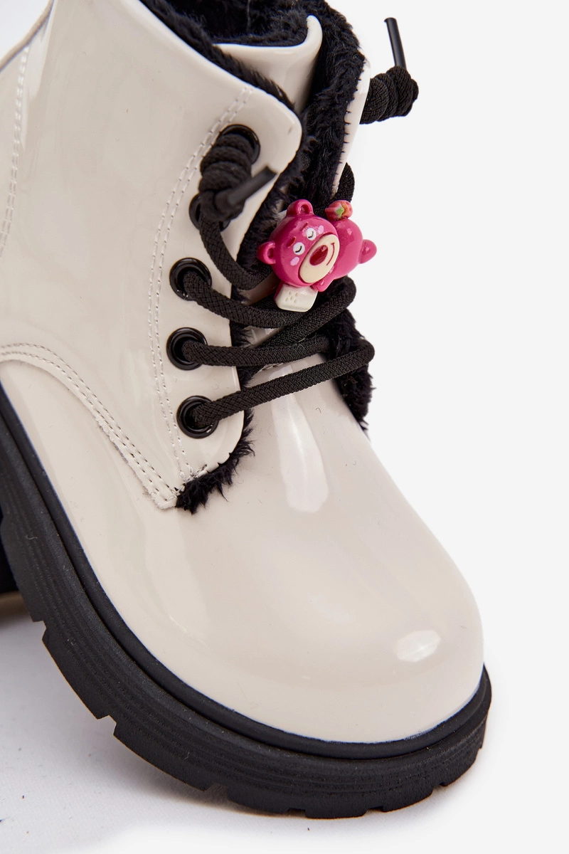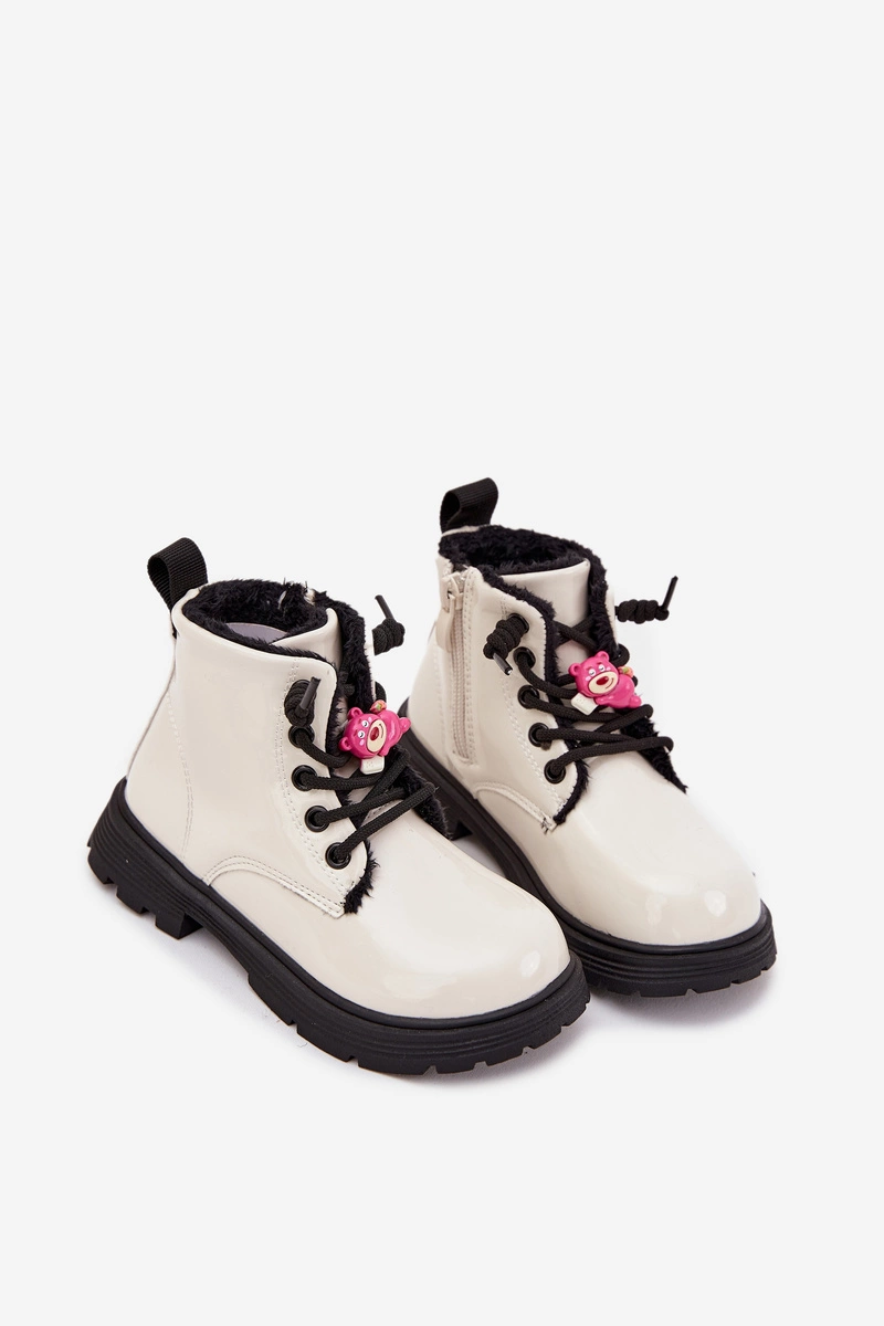 Botki dla dziewczynek z lakierowanej eko skóry to obuwie, które łączy w sobie praktyczność i modny wygląd. Model posiada w sznurowanie oraz praktyczny zamek, co sprawia, że buty można szybko zakładać i wygodnie dopasować do stopy. Wnętrze ocieplane miękkim futerkiem zapewnia ciepło i komfort nawet w chłodniejsze dni, chroniąc stopy przed zimnem. Dodatkowym atutem jest urocza przypinka w kształcie misia umieszczona na sznurowaniu, która nadaje bucikom dziecięcego uroku i wyjątkowego charakteru. To botki idealne do codziennego noszenia w sezonie jesienno-zimowym – sprawdzą się zarówno w szkole, jak i podczas spacerów czy rodzinnych wyjść.