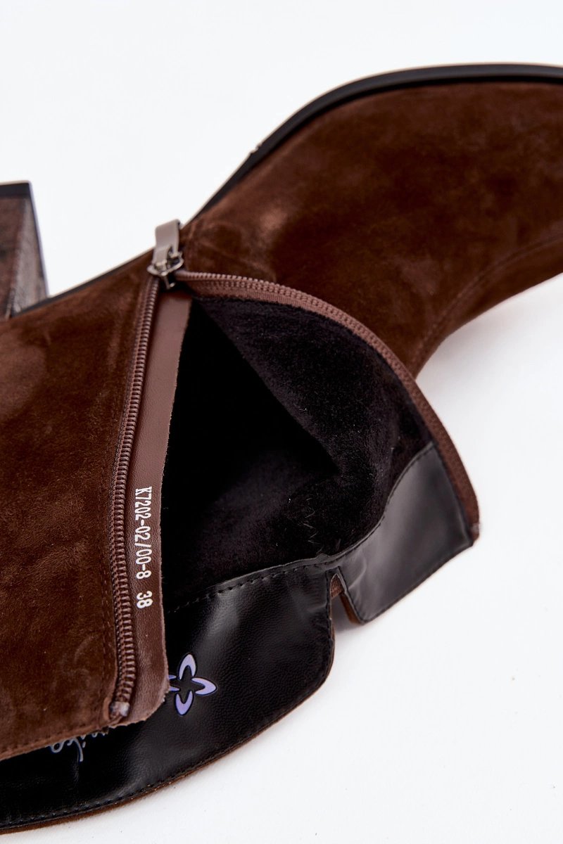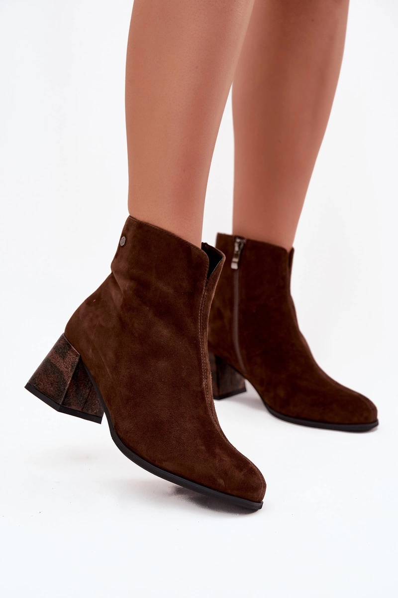 Botki damskie marki Maciejka. Wykonane z wysokiej jakości naturalnej skóry zamszowej, prezentują się niezwykle stylowo i szykownie. Model wyróżnia ozdobny obcas typu słupek, który dodaje charakteru, a jednocześnie zapewnia stabilność i wygodę noszenia. Zaokrąglone noski podkreślają ich kobiecy wygląd, a praktyczne zapięcie na zamek ułatwia zakładanie. Wnętrze ocieplone miękkim kocem obuwniczym gwarantuje komfort w chłodniejsze dni. Dodatkowym elementem dekoracyjnym jest przeszycie biegnące wzdłuż cholewki, które optycznie wysmukla stopę. To botki idealne do jesienno-zimowych stylizacji, które łączą wygodę z ponadczasowym stylem. Przy wyborze rozmiaru prosimy sugerować się tabelą rozmiarów.