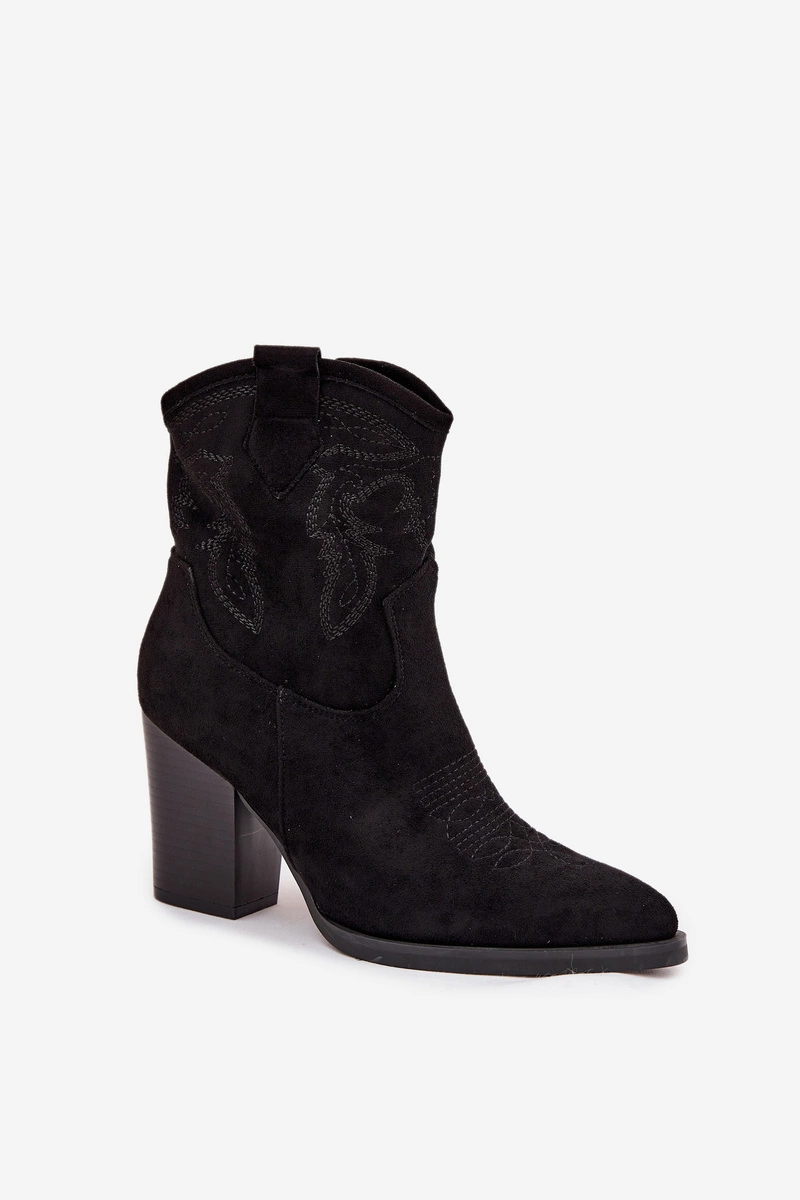 Damskie botki w stylu kowbojek wykonane z eko zamszu. Model osadzony został na stabilnym obcasie typu słupek, który optycznie wysmukla sylwetkę. Szpiczaste noski nadają całości kobiecego charakteru, a ozdobne przeszycia na cholewce podkreślają kowbojski wygląd. Praktyczne zapięcie na zamek ułatwia zakładanie i zdejmowanie butów. To stylowe botki, które doskonale uzupełnią zarówno codzienne, jak i bardziej eleganckie stylizacje, dodając im wyrazistości i charakteru.