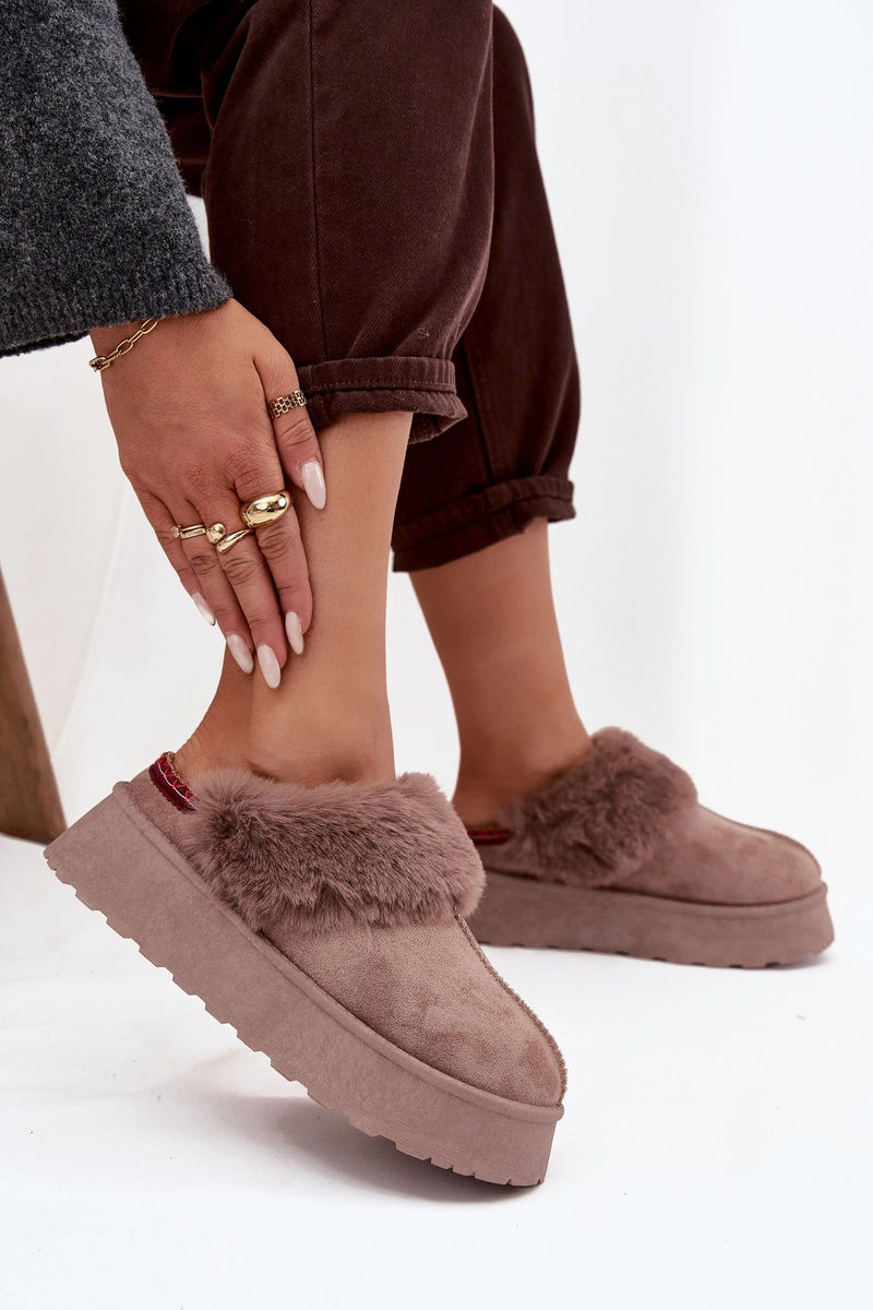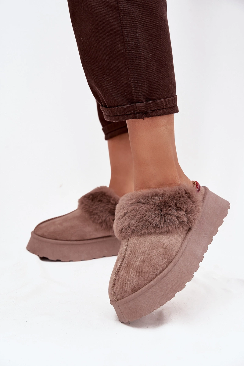 Śniegowce Damskie Na Platformie Z Futerkiem I Haftem Ciemnobeżowe Querina